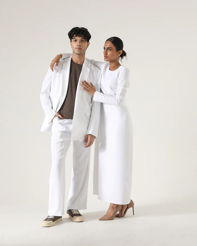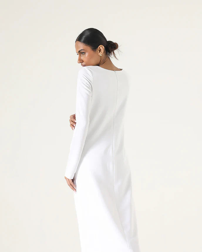 Straight full length dress with full sleeves and round neck.