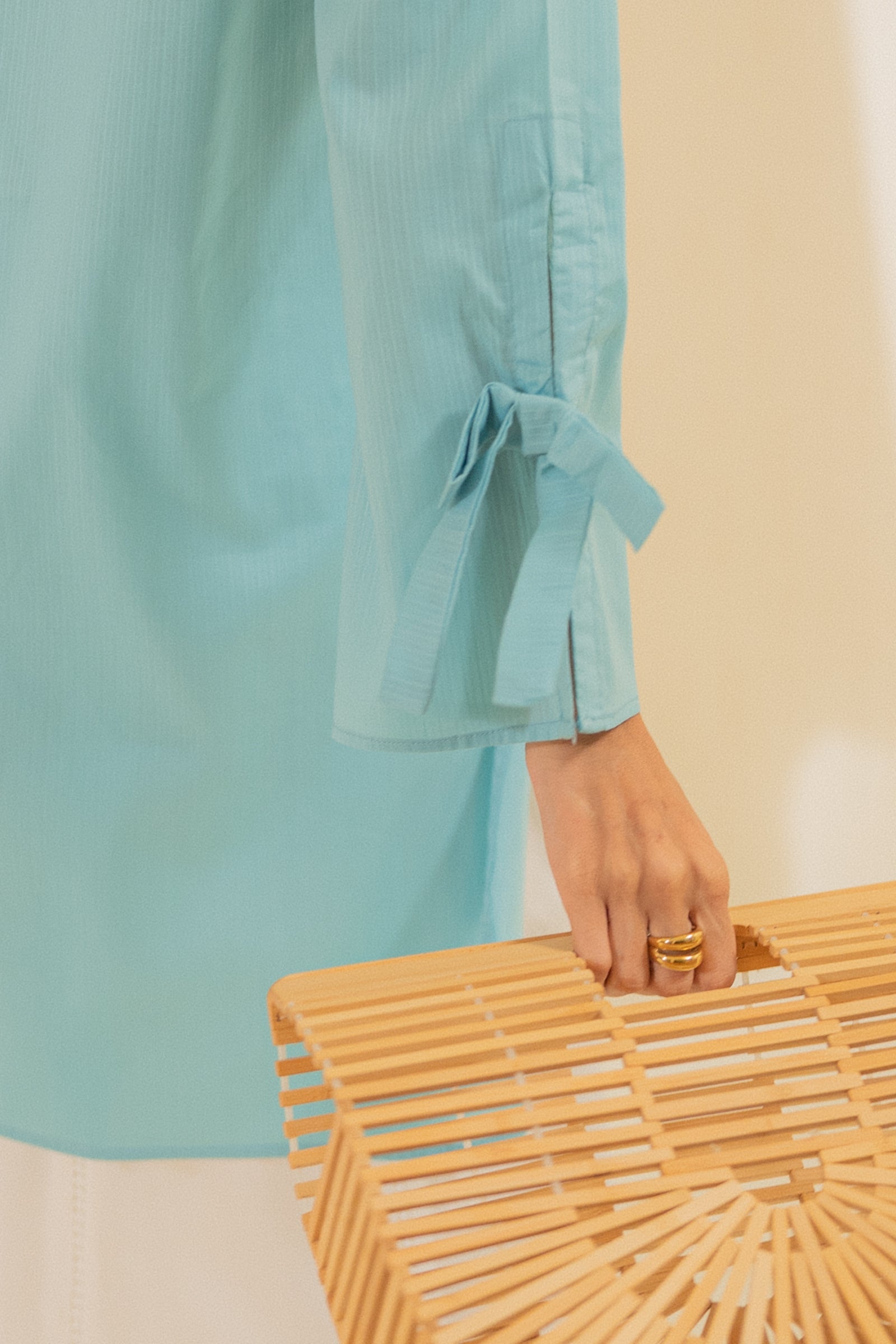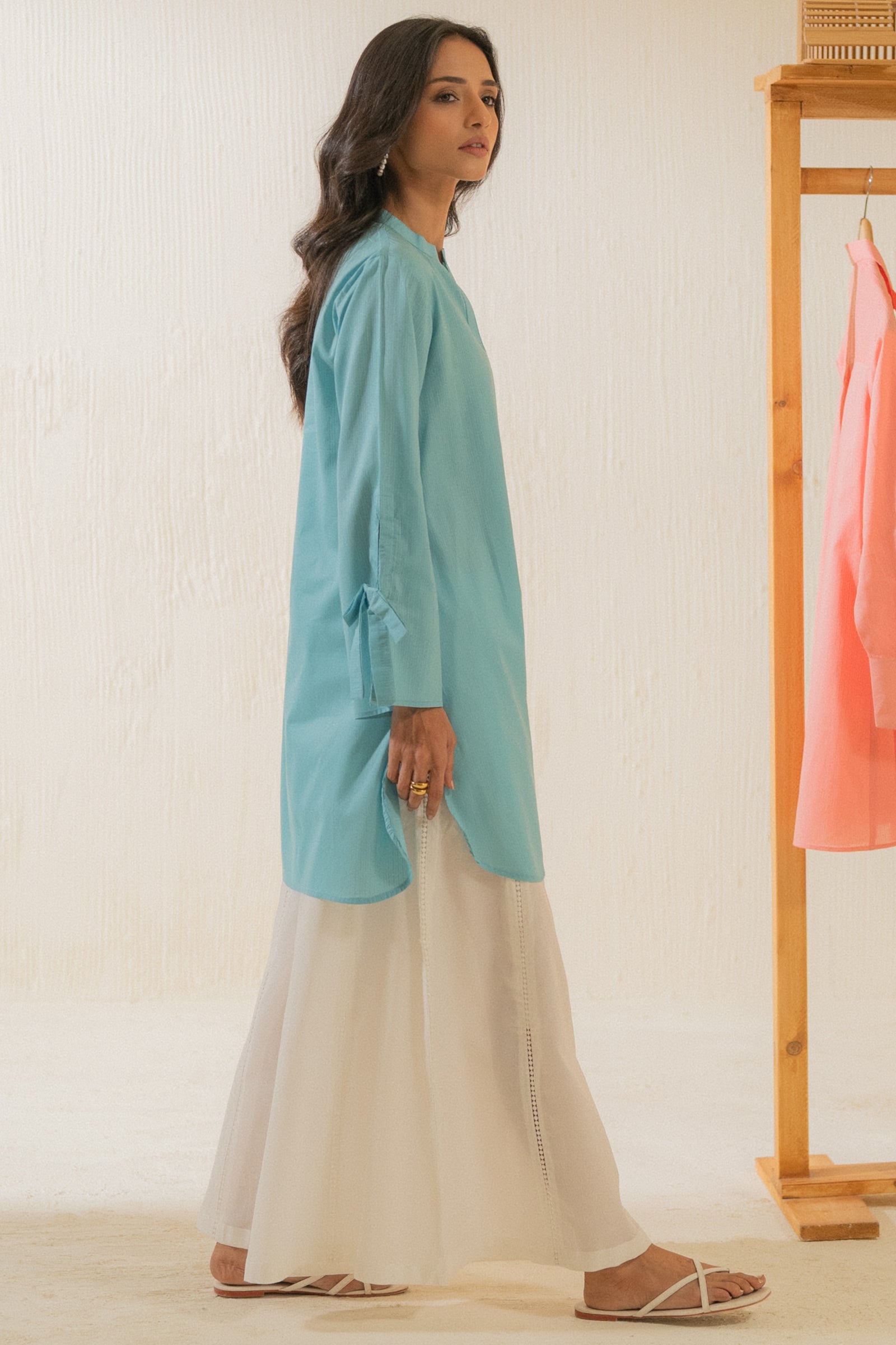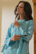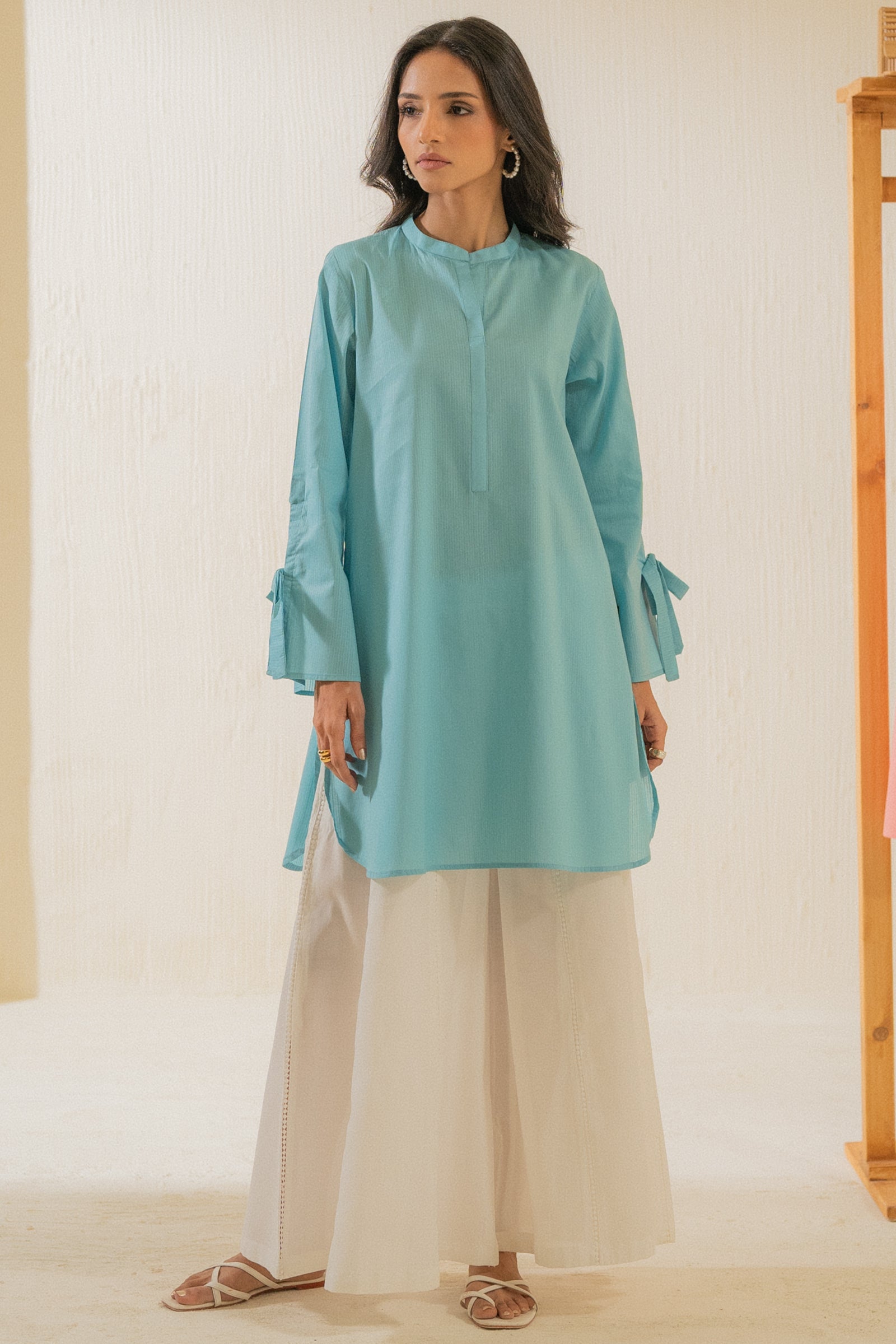 A sky blue long-sleeved loose fit kurta with a straight cut and a band collar. It features a concealed button placket and tie details at the sleeves, adding a subtle feminine touch.