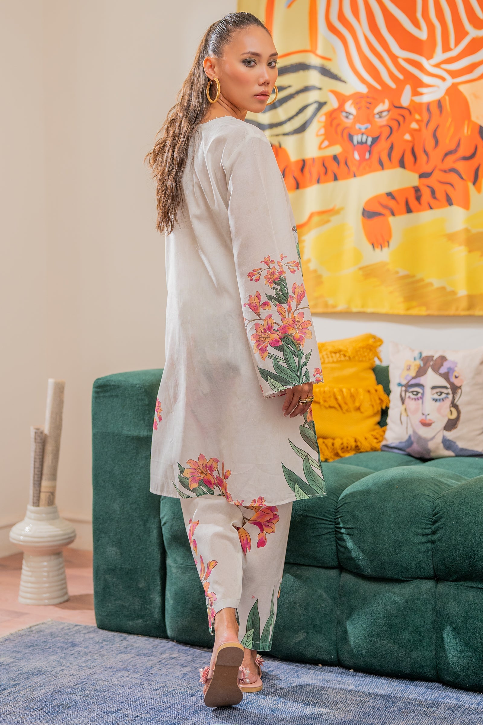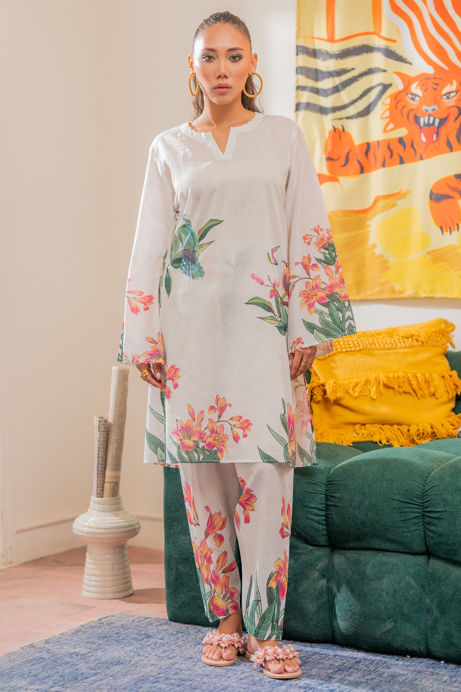 This straight kurta and shalwar is adorned with vibrant botanical and bird prints in shades of pink, green, and orange.