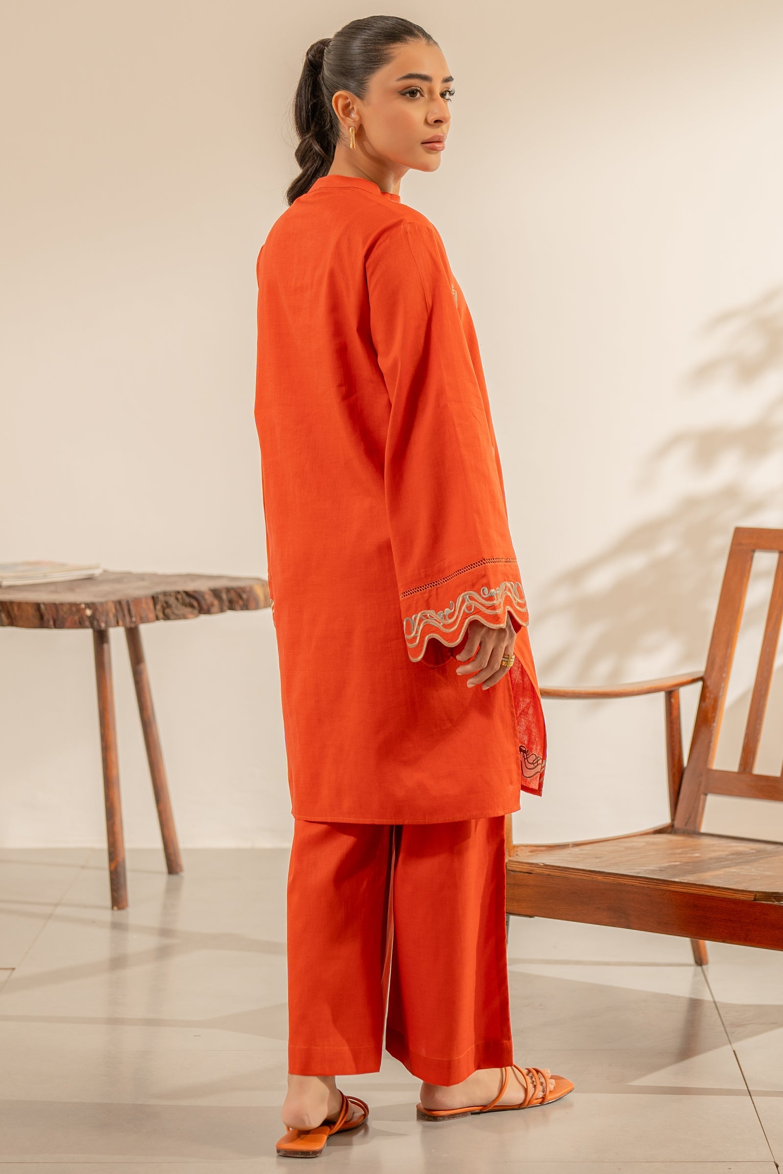 A vibrant orange two-piece set featuring a straight kurta with a split neckline and beige embroidery of tropical motifs and waves. Paired with wide-leg trousers for a breezy, summery look.