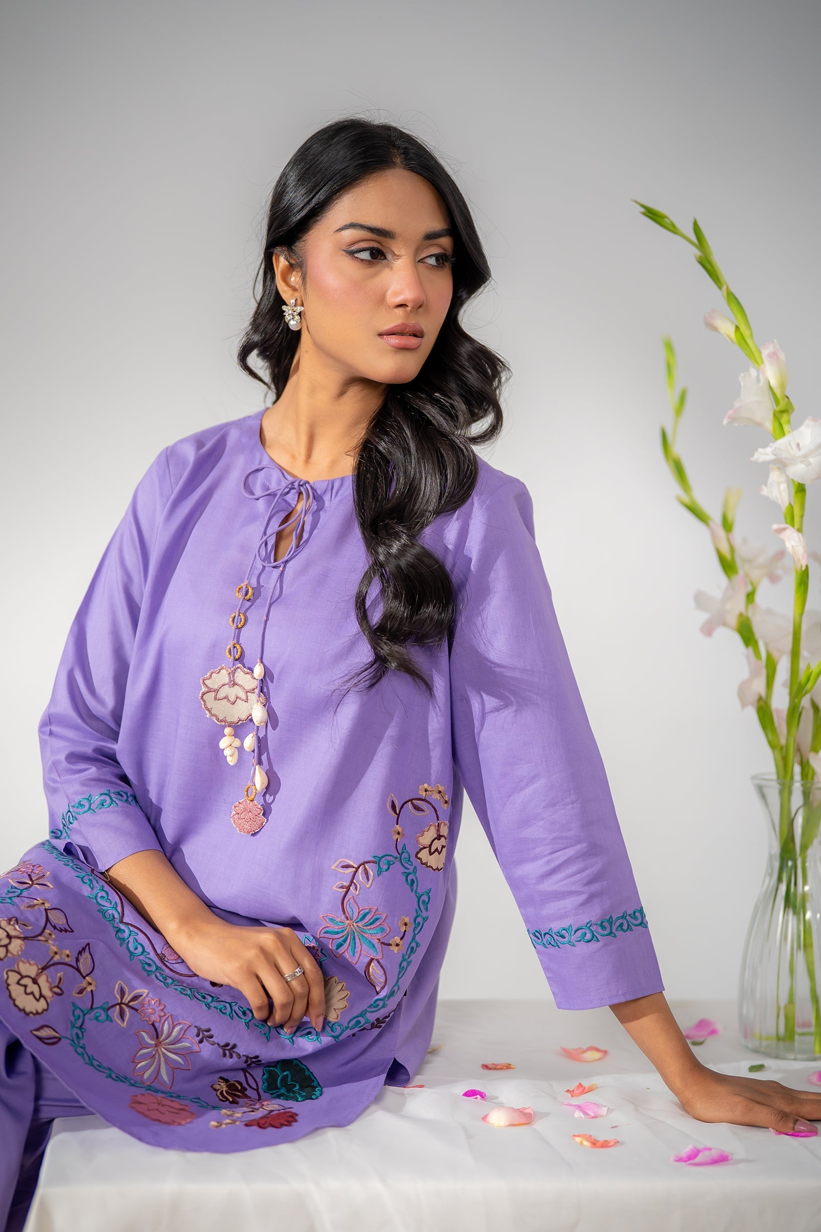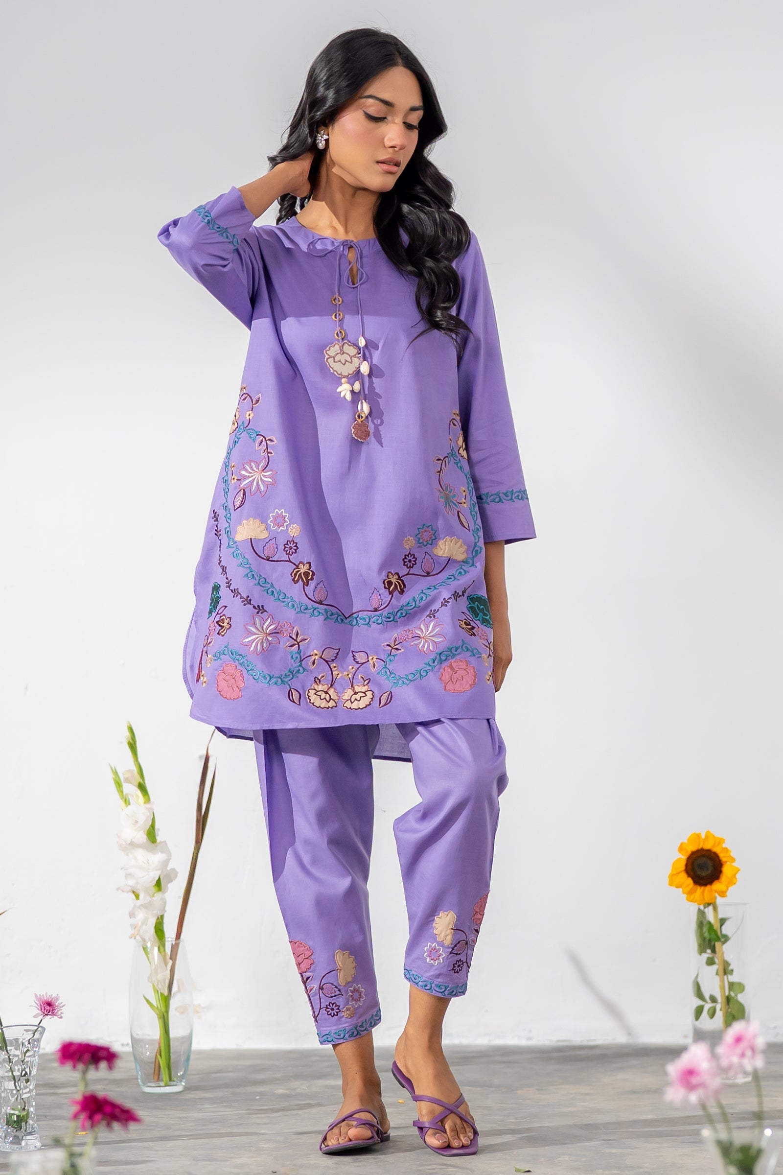 Soft lilac kurta set adorned with vibrant floral embroidery, paired with sleek shalwar for a graceful, coordinated look with delicate detailing for effortless everyday elegance.