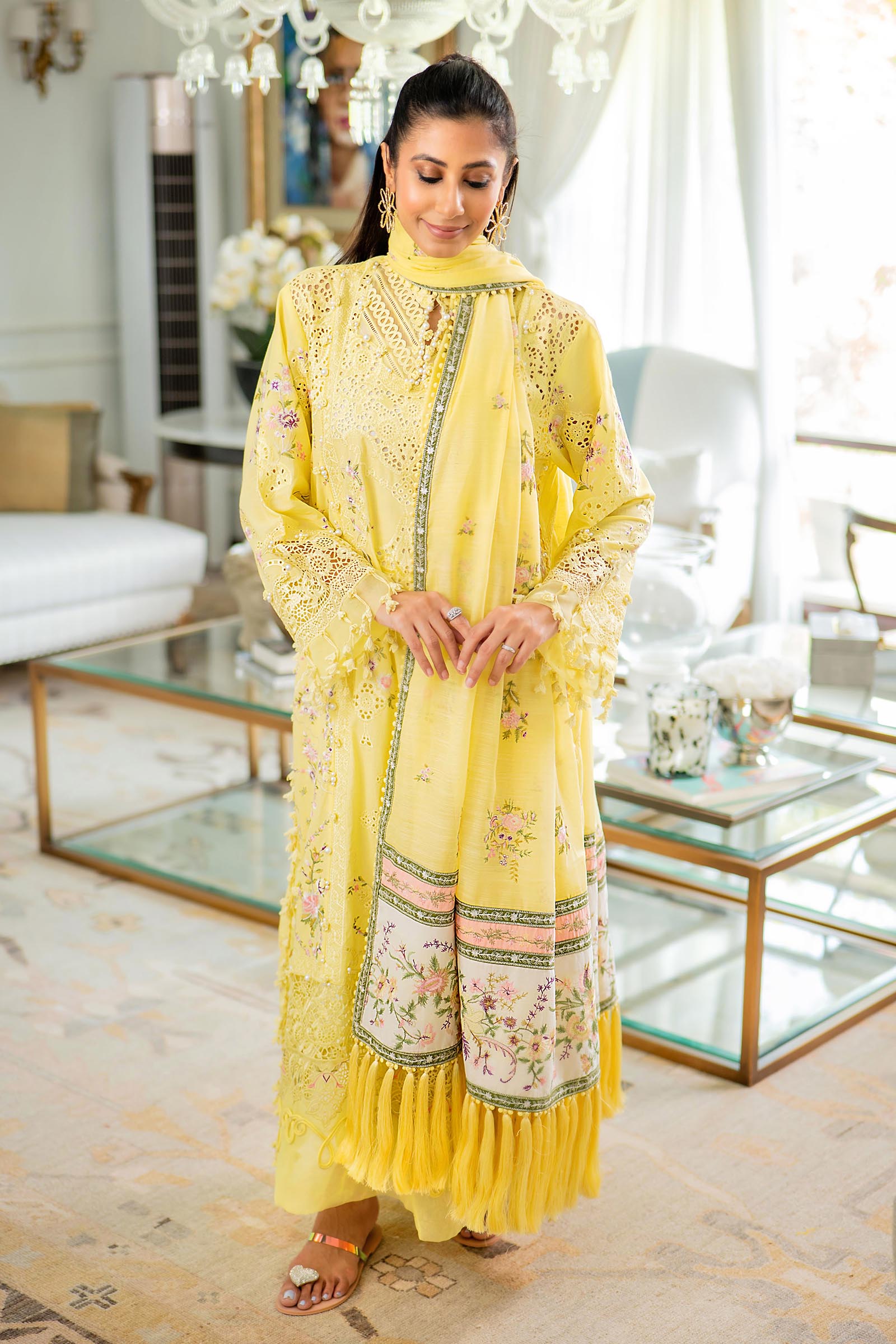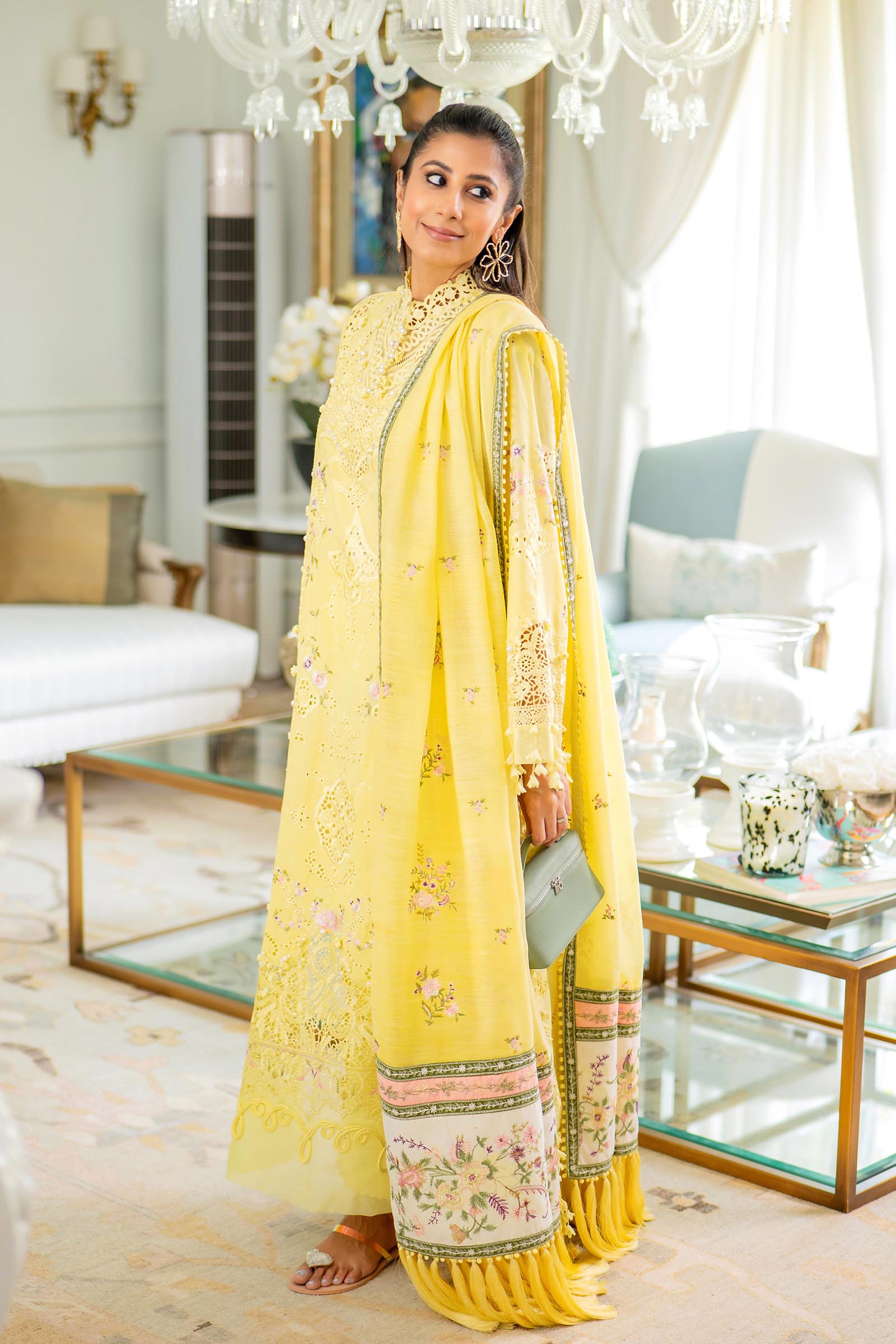 A soft yellow palette lends this ensemble a sense of warmth and serenity, flowing effortlessly with the season and lending itself beautifully to daytime soirées.