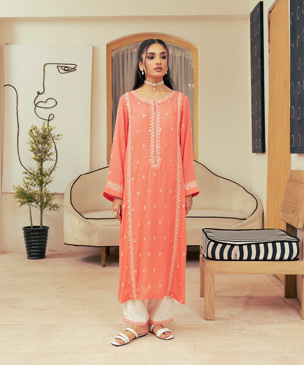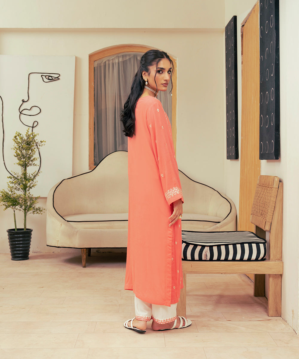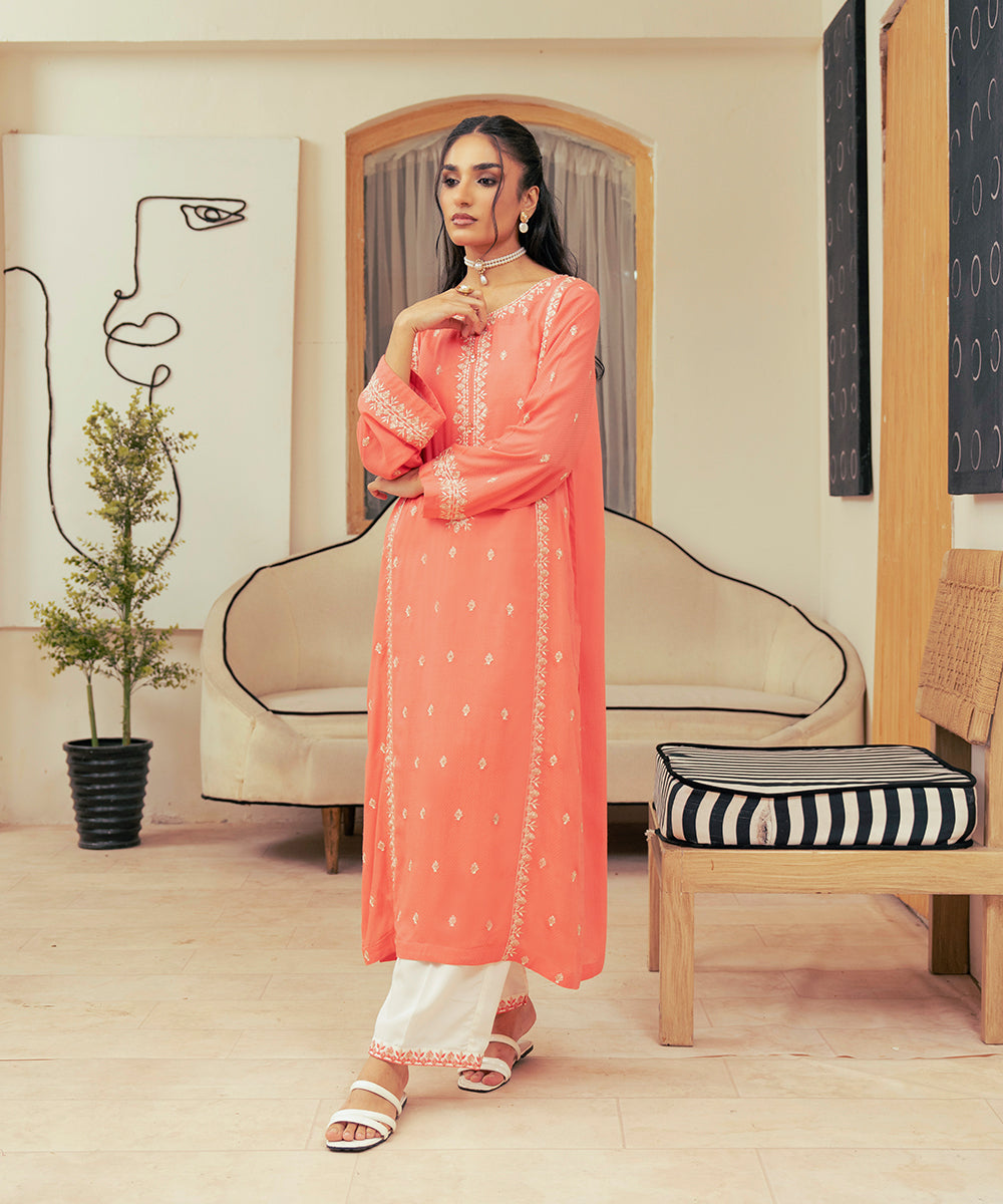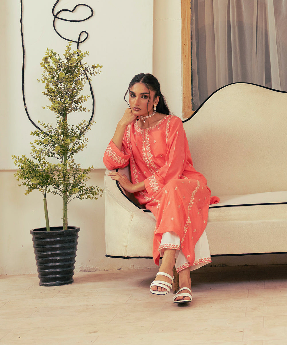 Description: Elegant Embroidered Coral Textured 2-Piece Set with White Embroidered Trousers Turn heads with this beautifully crafted 2-piece outfit, featuring a rich coral self-textured fabric adorned with delicate embroidery that adds a refined touch to your look. The soft, breathable fabric offers both comfort and sophistication, perfect for festive gatherings or semi-formal occasions. Paired effortlessly with white trousers detailed with subtle embroidery, this ensemble strikes a perfect balance between tradition and modern elegance.