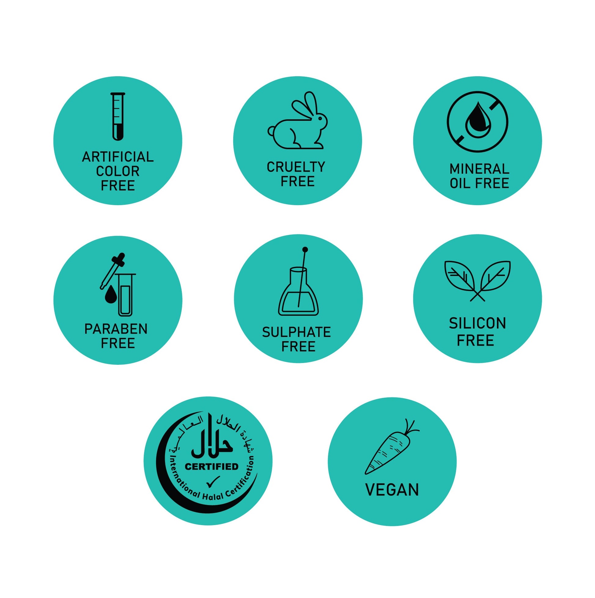 Artificial Color Free, Cruelty Free, Mineral Oil Free, Paraben Free, Sulphate Free, Silicone Free, Halal, Vegan