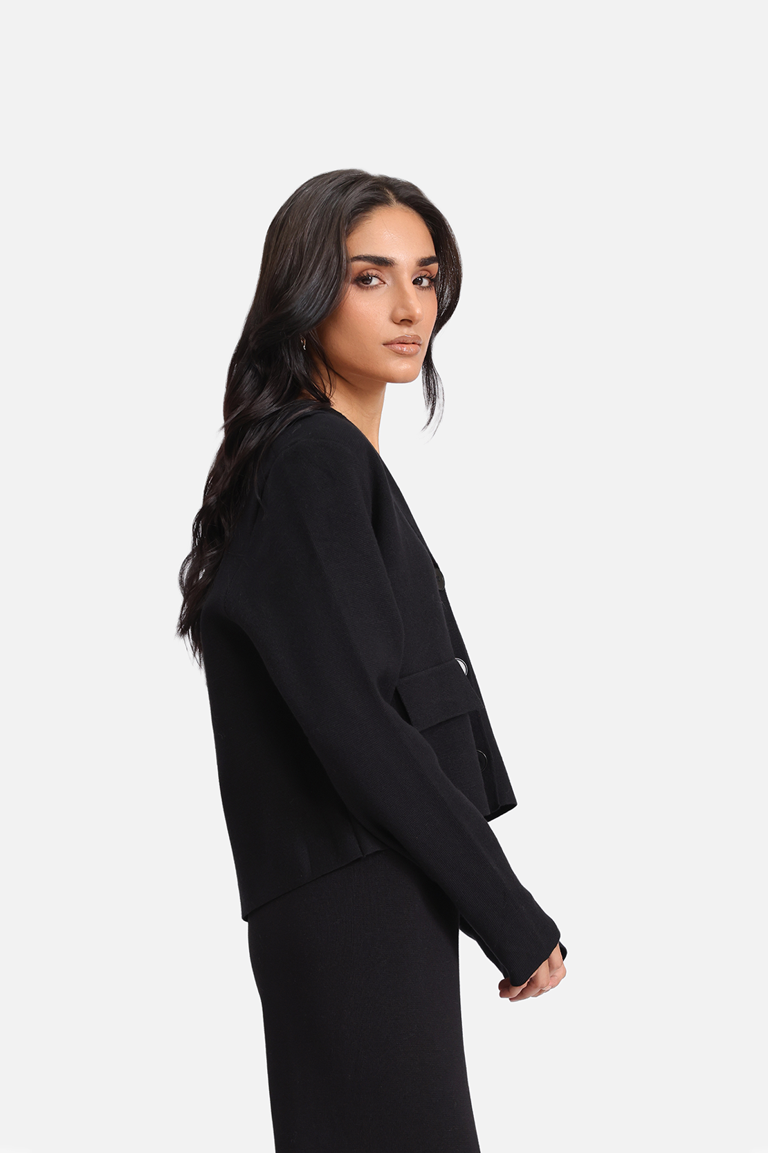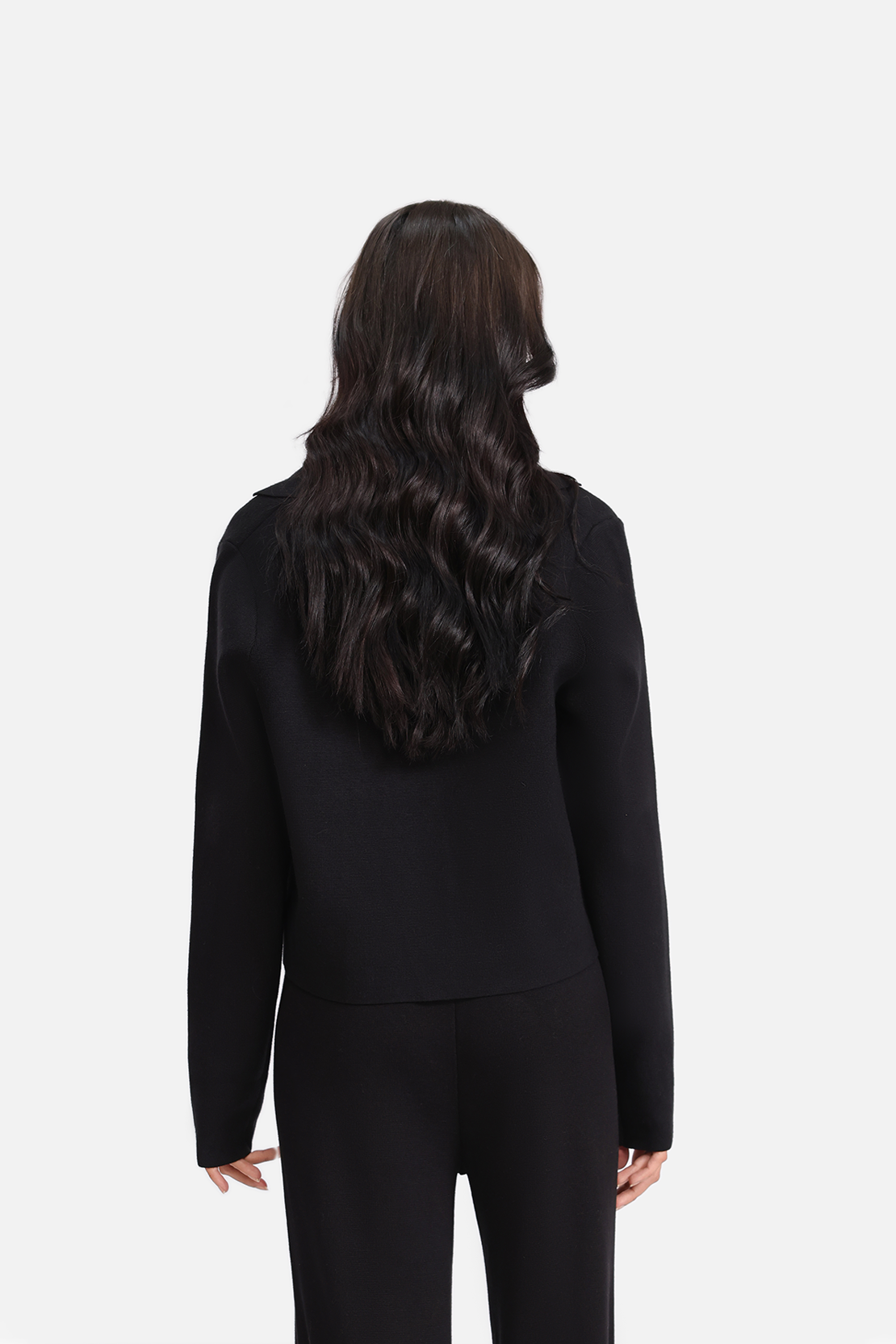 This short cardigan is crafted from soft acrylic sweater fabric and features drop shoulders with long sleeves for a relaxed fit. Designed with a notched lapel collar and front button fastening, it combines cozy comfort with a stylish, contemporary look.