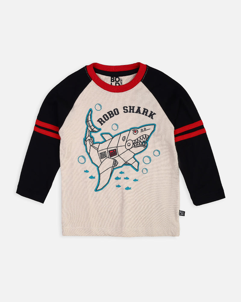 Boys Beige Full Sleeve T-Shirt With Robo Shark Graphic Print