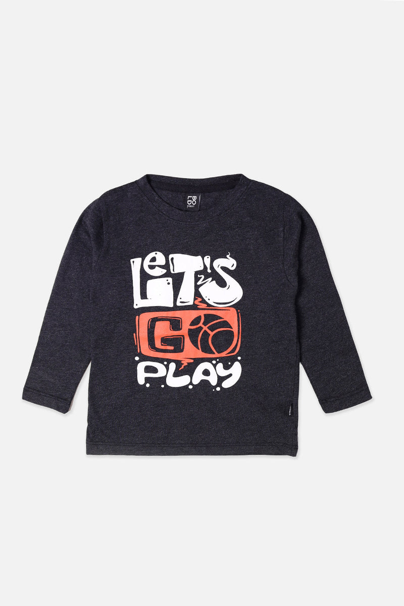 Boys Charcoal Lets Go Play Printed Full Sleeve T-Shirt