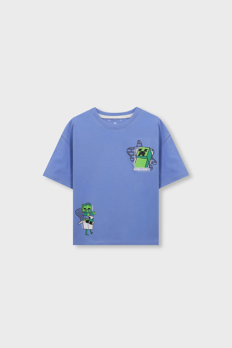 This boys relaxed fit t shirt is made from soft jersey fabric in a fresh blue shade. Featuring a playful pixel inspired cube character graphic, the design brings a gaming style energy. The roomy silhouette ensures comfort, making it perfect for daily wear, playtime, and casual outings.
