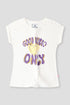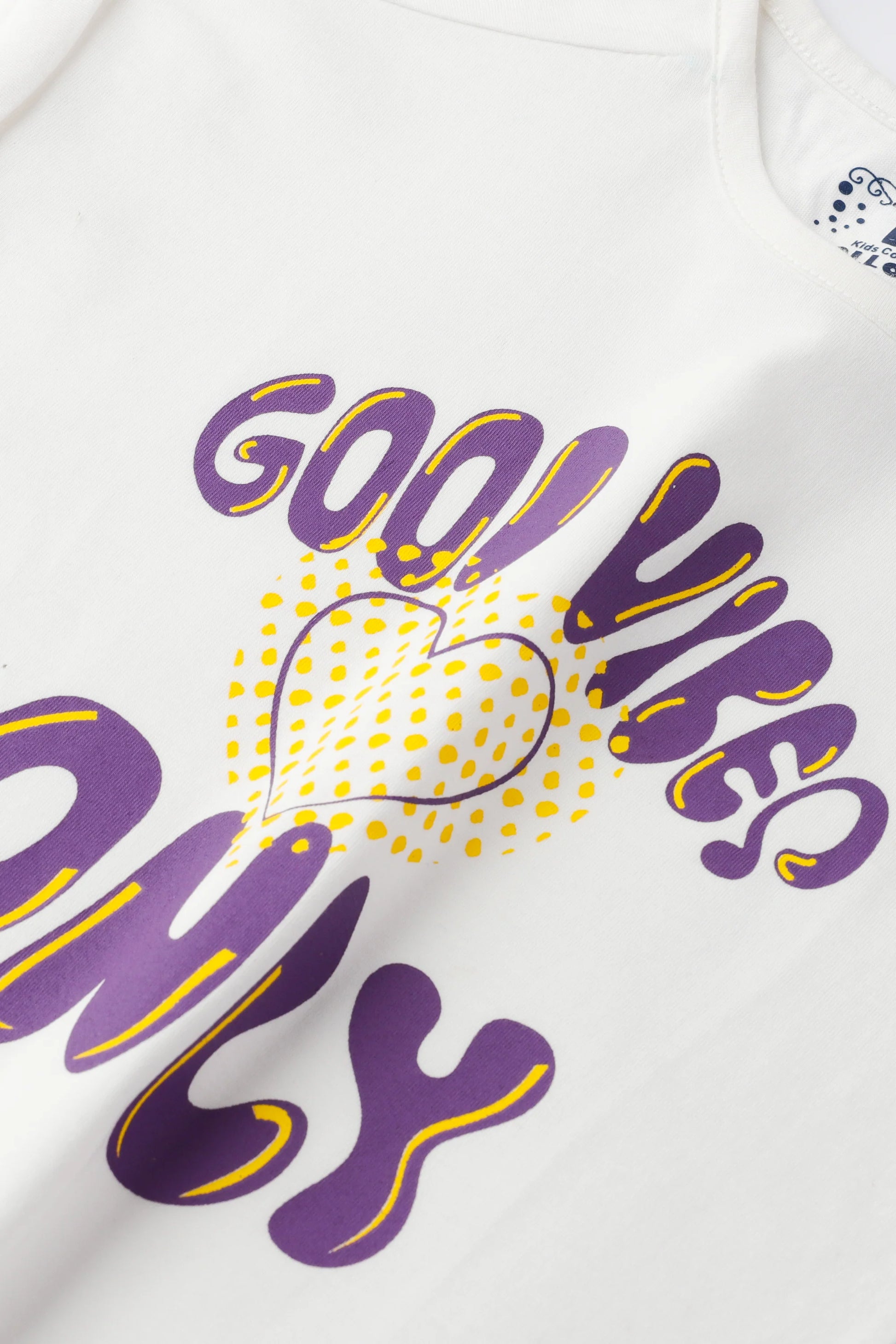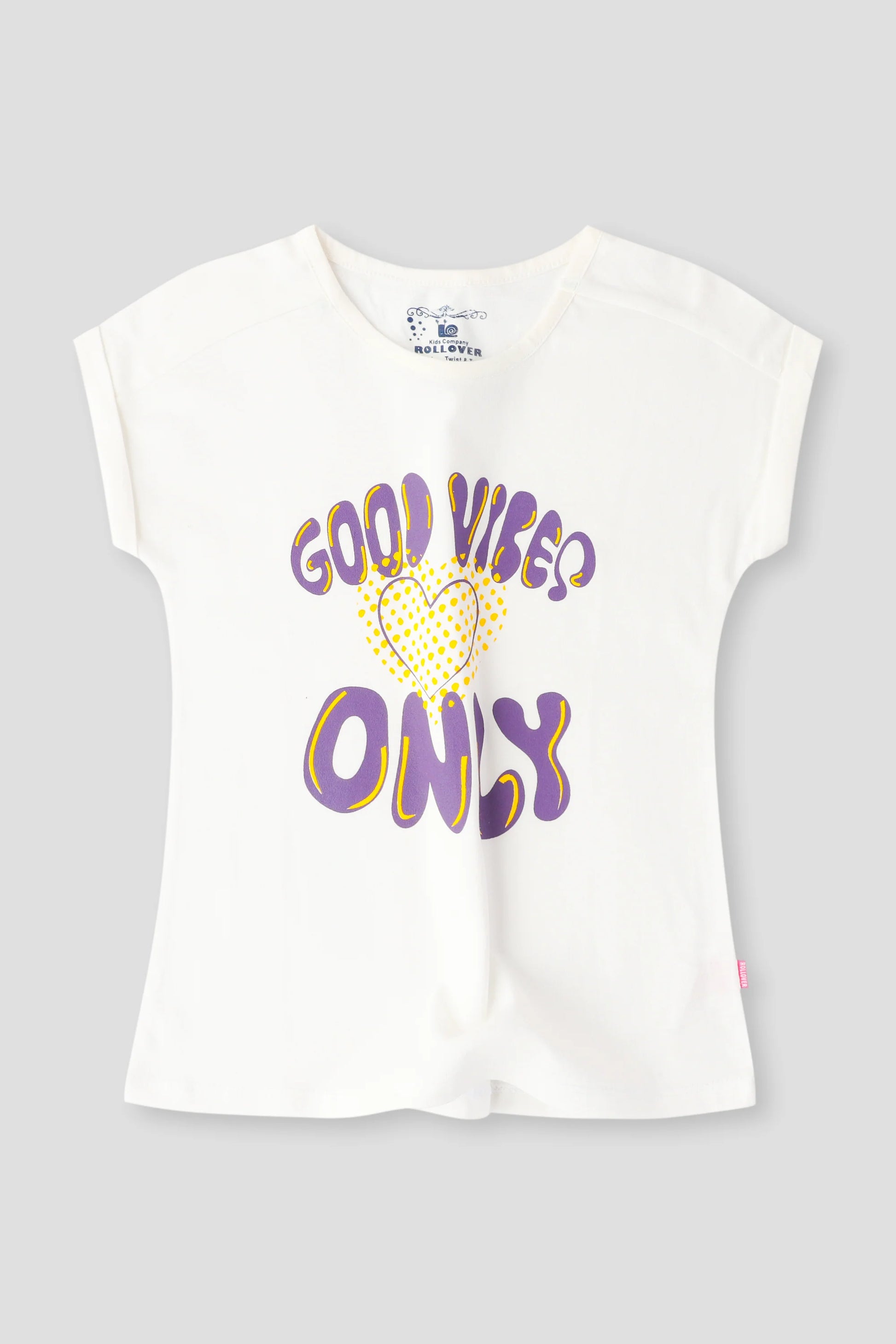 Let her radiate positivity with the Good Vibes Only Tee! Crafted in soft white jersey fabric, this stylish T-shirt features bold purple lettering and a playful heart graphic. With its comfy fit and trendy design, it's perfect for casual outings, playdates, and spreading good energy all around!
