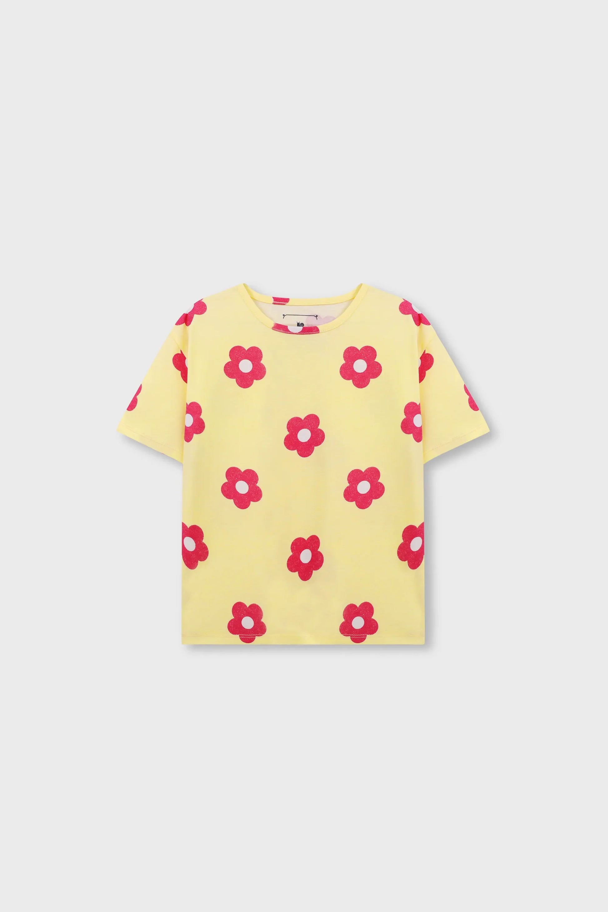 This drop shoulder t shirt brings joyful style with its light yellow base and vibrant floral design. Crafted from soft jersey, it feels gentle on the skin while the loose fit ensures relaxed wear. A perfect choice for carefree days filled with play, creativity, and comfort.