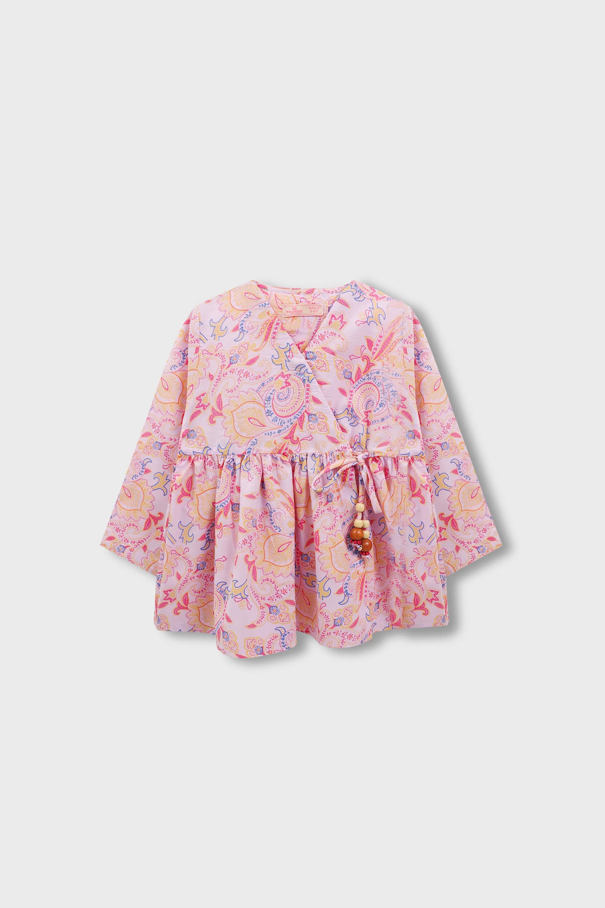 This girlsâ top is crafted from soft breathable cotton, featuring an all-over pink paisley print for a bright, festive look. The peplum silhouette adds flare, while bell sleeves create a stylish finish. Decorative wooden beads on the front give a traditional touch, making it perfect for casual wear and occasions.