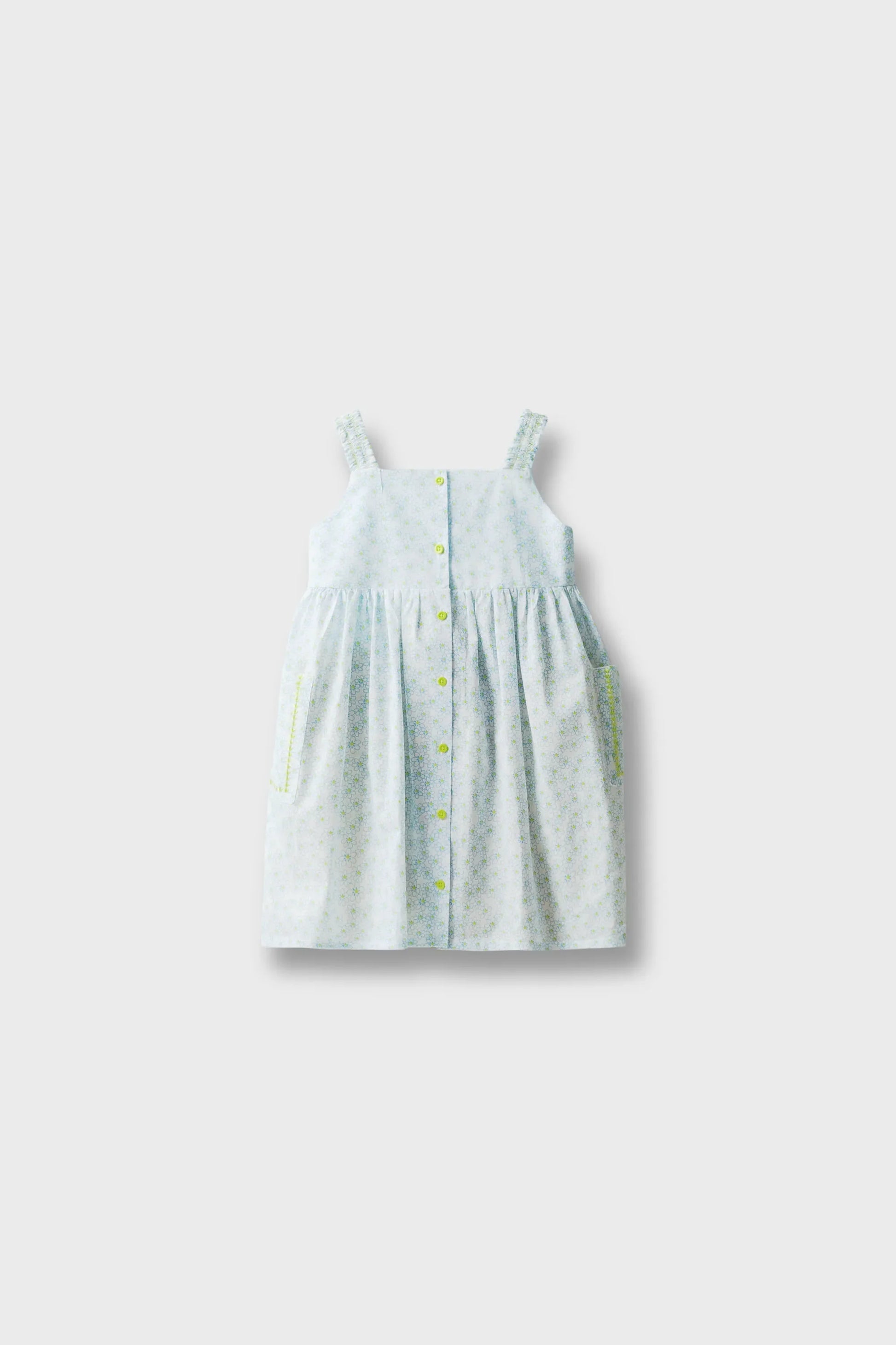 Bring some floral flair to your little oneâÂÂs wardrobe with this sky blue and white cotton dress. It has charming pockets on the sides for storing tiny treasures and a cute button-up front. Ideal for outdoor adventures or family picnics, this dress combines style with comfort.