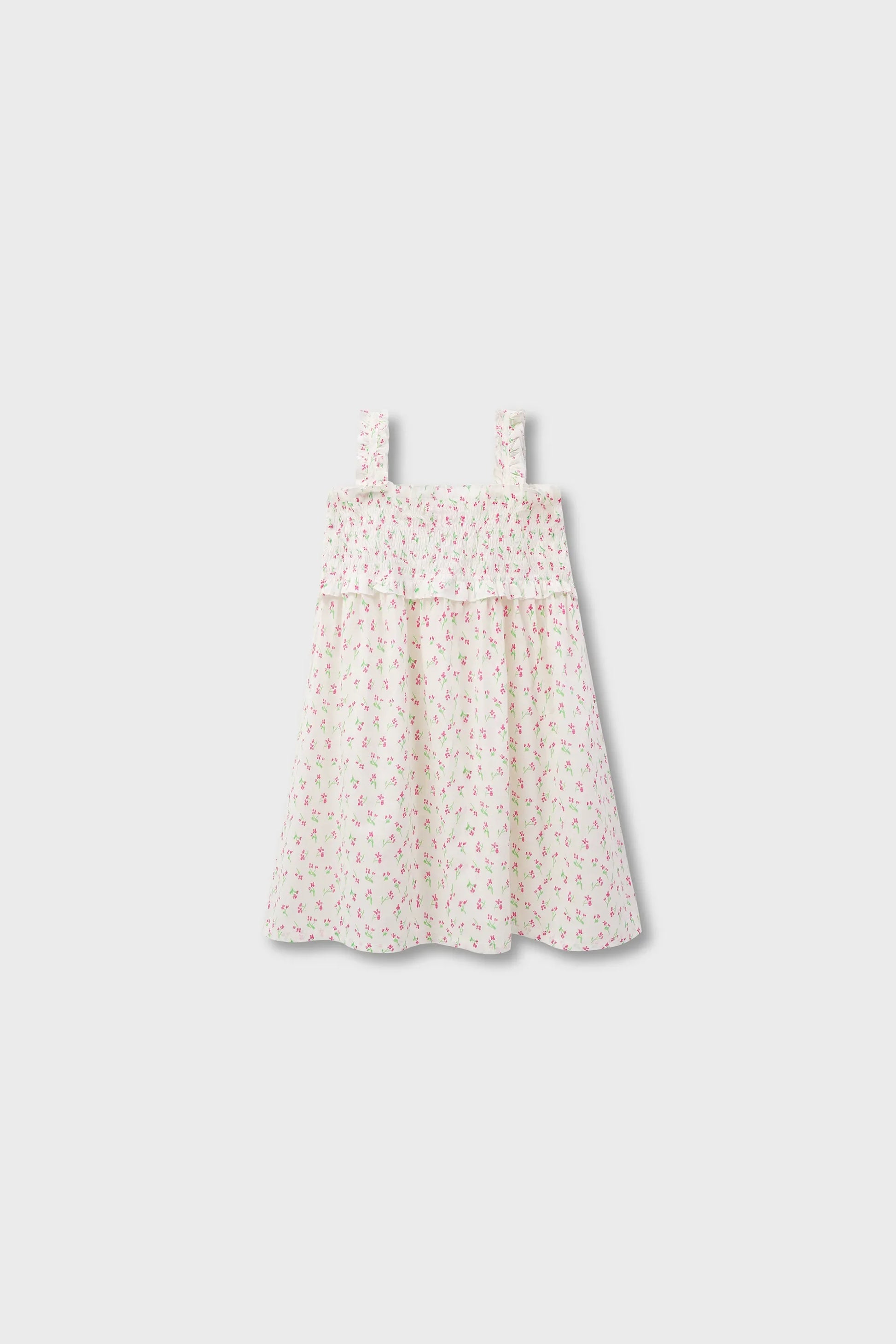 This white cotton dress features a delicate pink floral print and a soft, breathable feel perfect for warm weather. Designed with wide straps and a smocked bodice for a snug, comfortable fit, it flows into a gathered skirt for easy movement. A charming everyday dress for outings, playtime, and summer events.