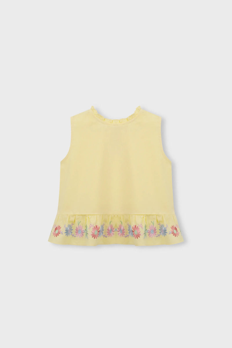 This sleeveless cotton top features a smooth yellow base paired with a delicate frill around the neckline. Finished with vibrant floral embroidery at the bottom, it blends comfort with charm. The lightweight fabric allows easy movement, making it a lovely choice for summer wear and everyday adventures.