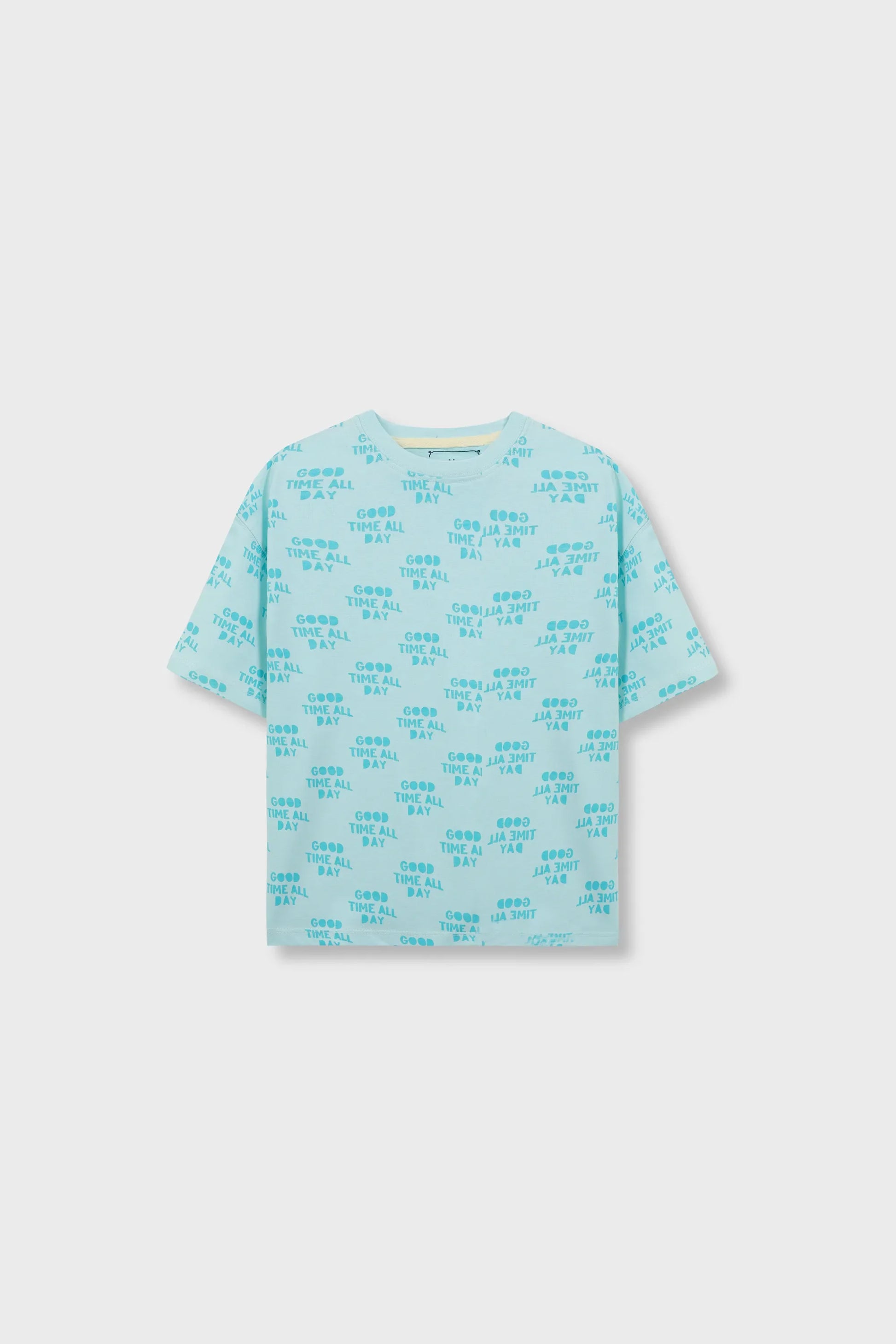 A comfortable boxy fit t shirt made from smooth jersey fabric in a refreshing light mint tone. The repeated uplifting text print adds character without overpowering the design. Finished with a neat neckline and soft hems, it offers style and comfort in equal measure.