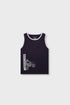 This boys tank top is made from soft jersey fabric in a deep navy blue shade. Designed with sleeveless arm openings and contrast binding around the neck and arms, it features a bold motocross inspired graphic. Lightweight and breathable, it is ideal for summer play and active days.