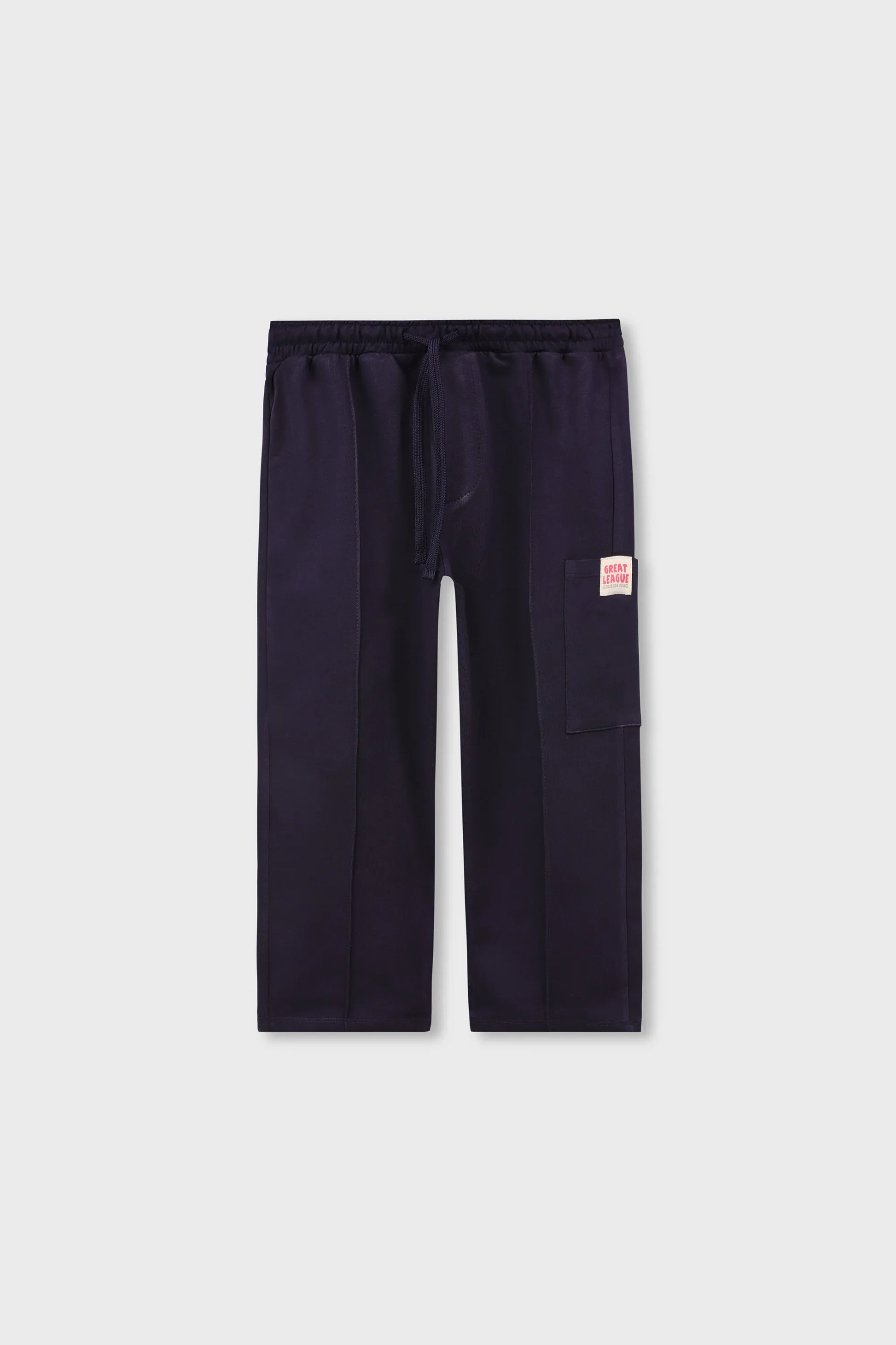 These straight-fit navy blue trousers are the perfect blend of comfort and style. Made from soft French terry fabric, they feature an elasticated waist with a drawstring, a functional pocket with a canvas patch, and a clean, straight-leg fit. The double needle stitch at the hem adds durability.