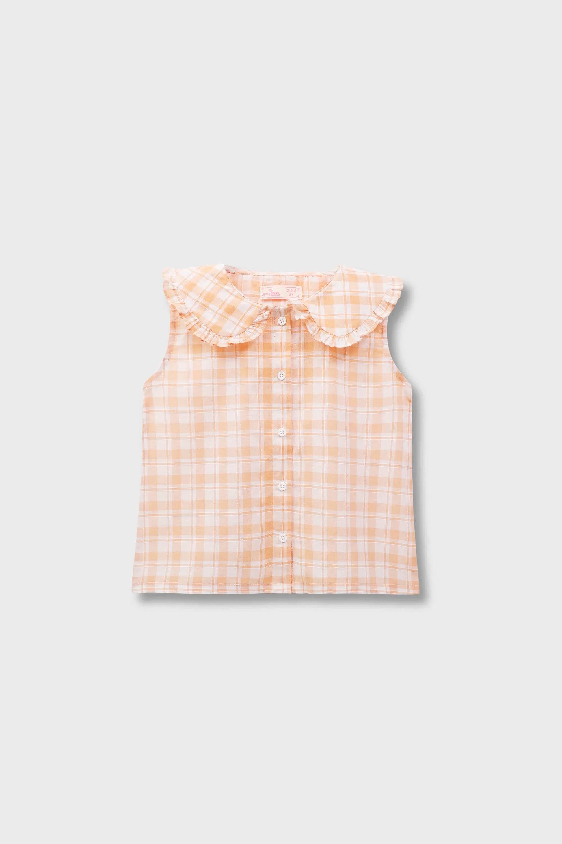 Featuring a refined orange plaid pattern, this cotton top is designed for effortless comfort and style. The frilled collar enhances its playful appeal, while the sleeveless cut allows freedom of movement. Ideal for casual wear, it pairs easily with skirts, shorts, or jeans.