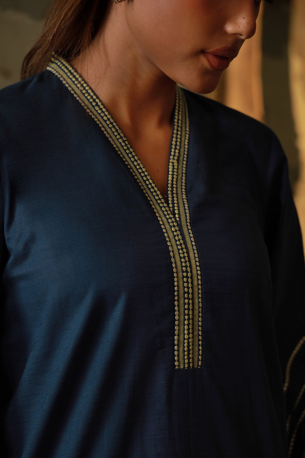 A navy blue suit featuring gradient-effect scenery embroidery on the daman and sleeves, evoking serene winter mountain landscapes. Paired with a soft grey and blue shawl, the look captures cool, alpine elegance—perfect for cozy, sophisticated winter wear.