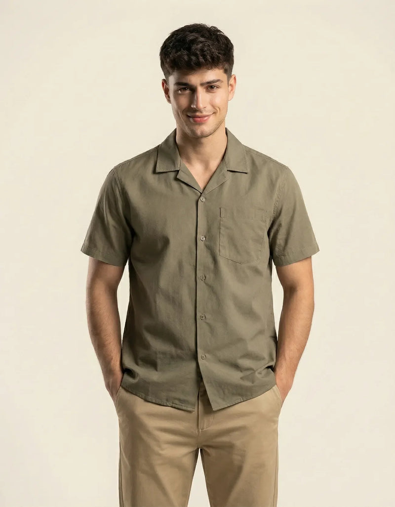 Relaxed fit camp collar button down shirt with side slit at hem. short sleeves with chest pocket on the left.