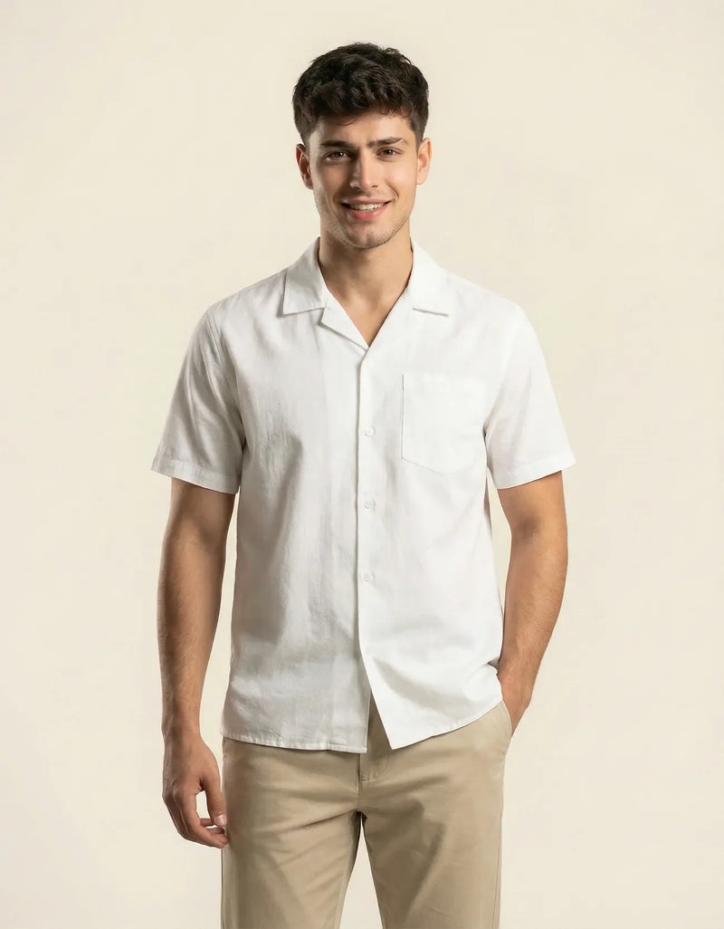 Relaxed fit camp collar button down shirt with side slit at hem. short sleeves with chest pocket on the left.