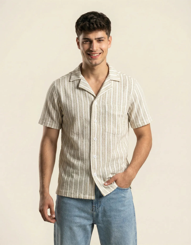 Regular fit stripe camp collar shirt with patch pocket at front. Button closure and short sleeves.
