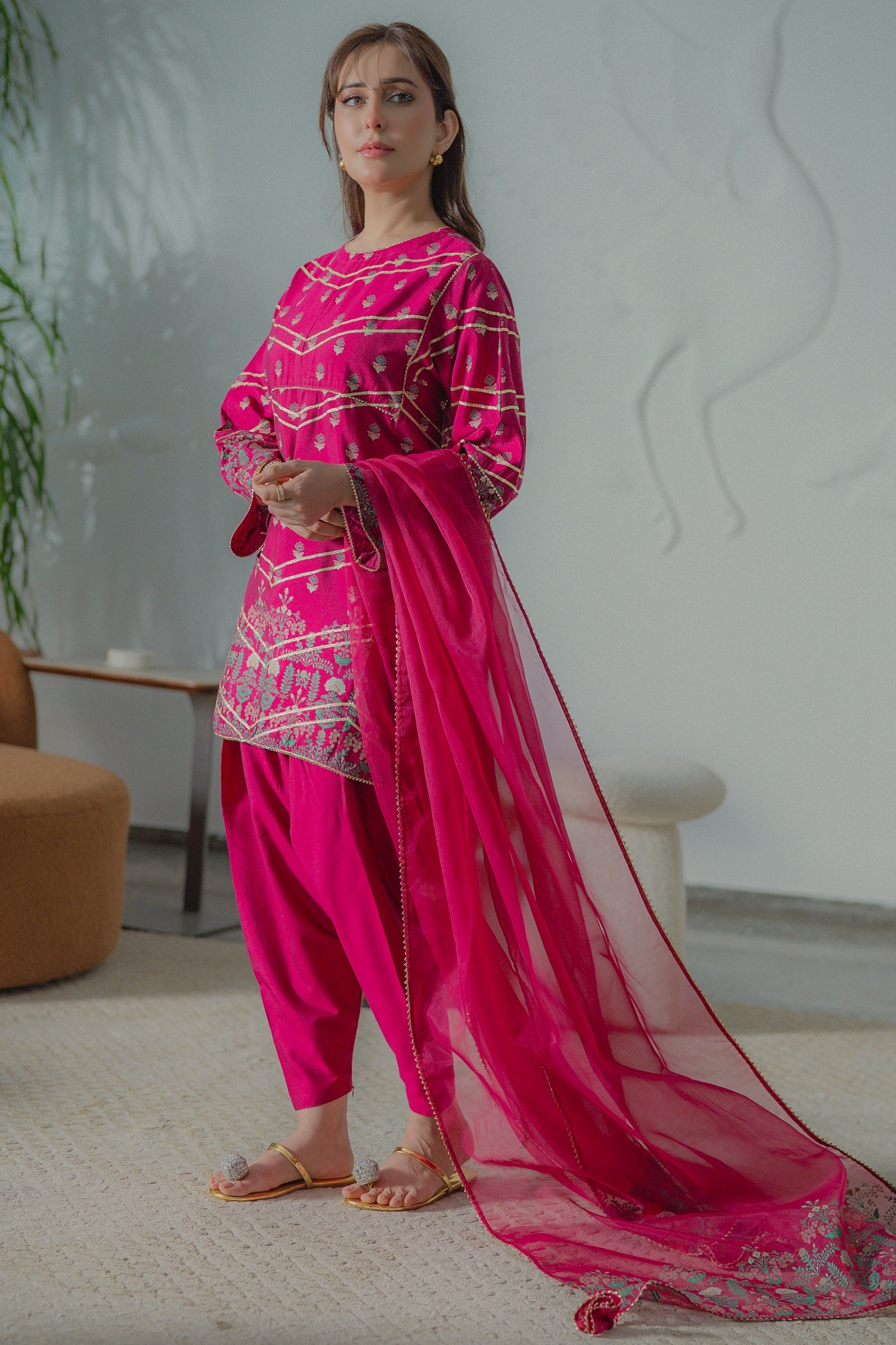 Stitched Embroidered Raw Silk Shirt + Culotte + Dupatta
