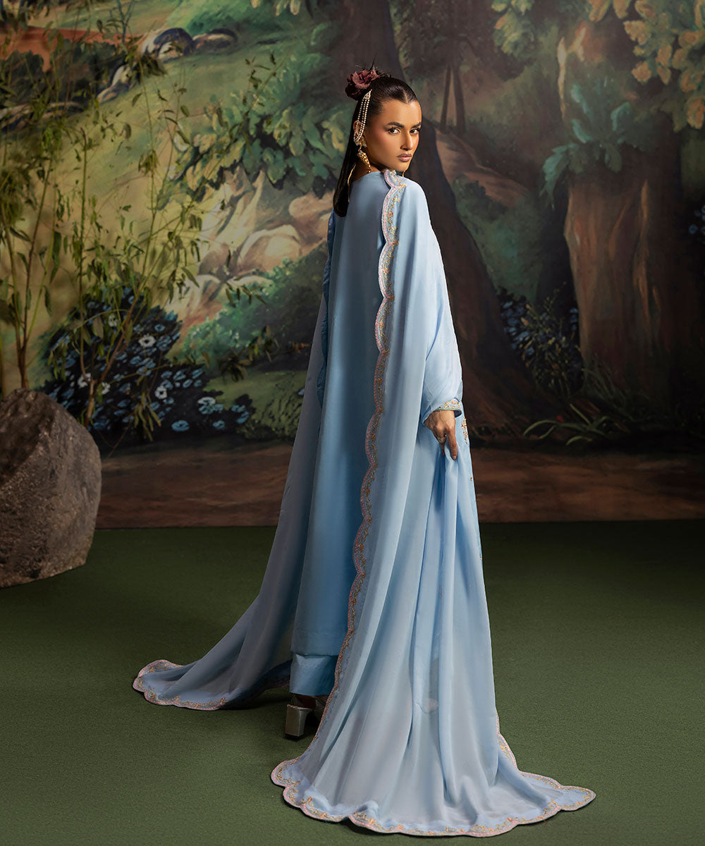 A powder blue silk canvas serves as a base for meticulously designed aari embroidery in pink, ivory and green. The intricately hand-embellished shirt is adorned with pearls and gold sequins. It is paired with flared trousers.