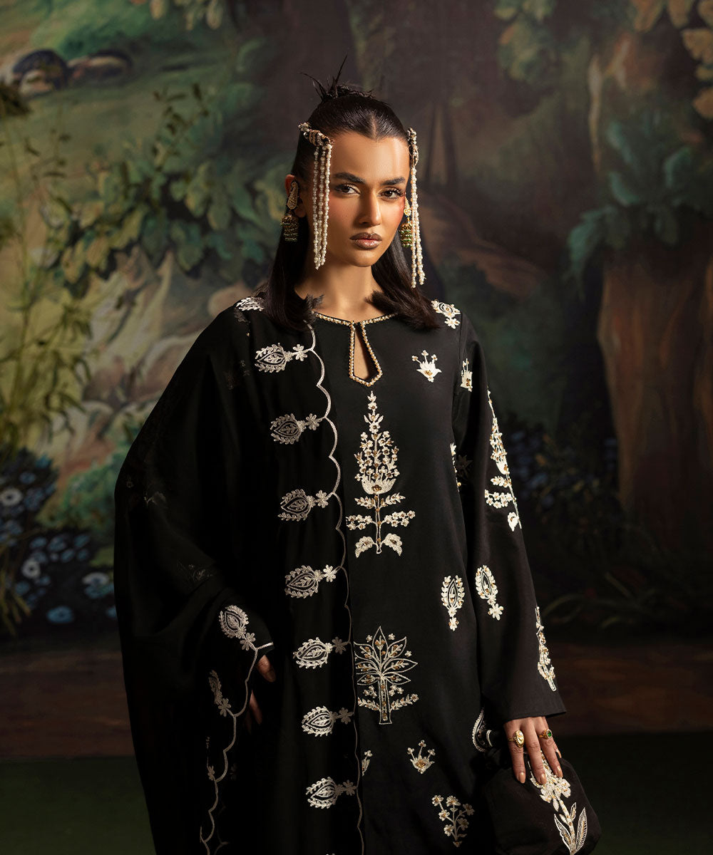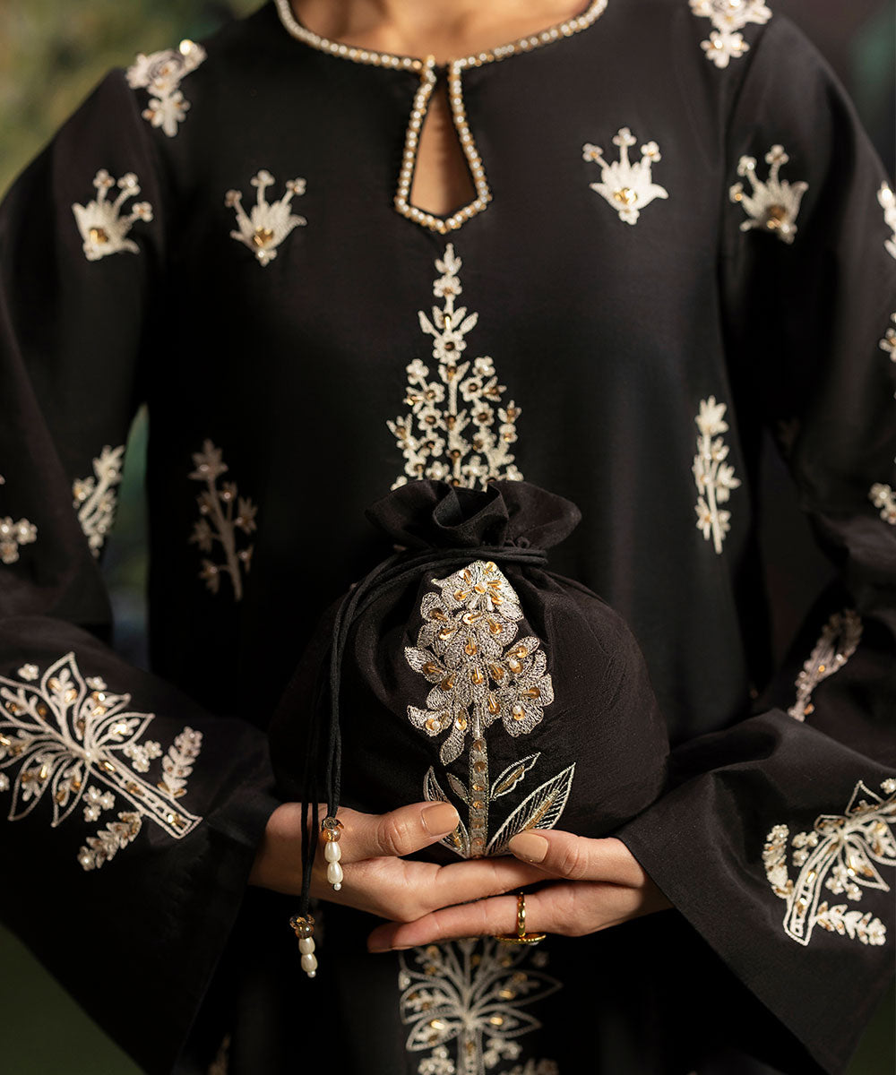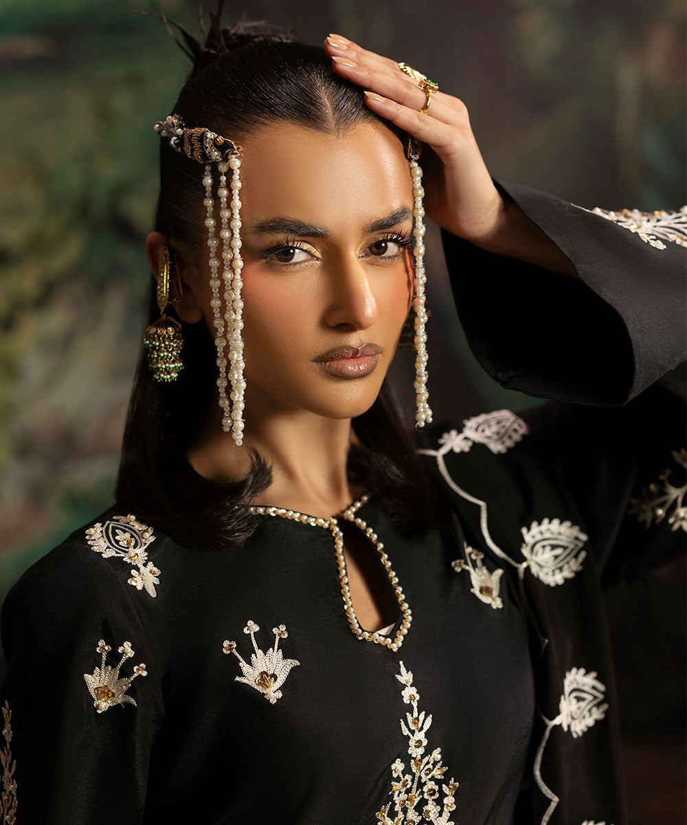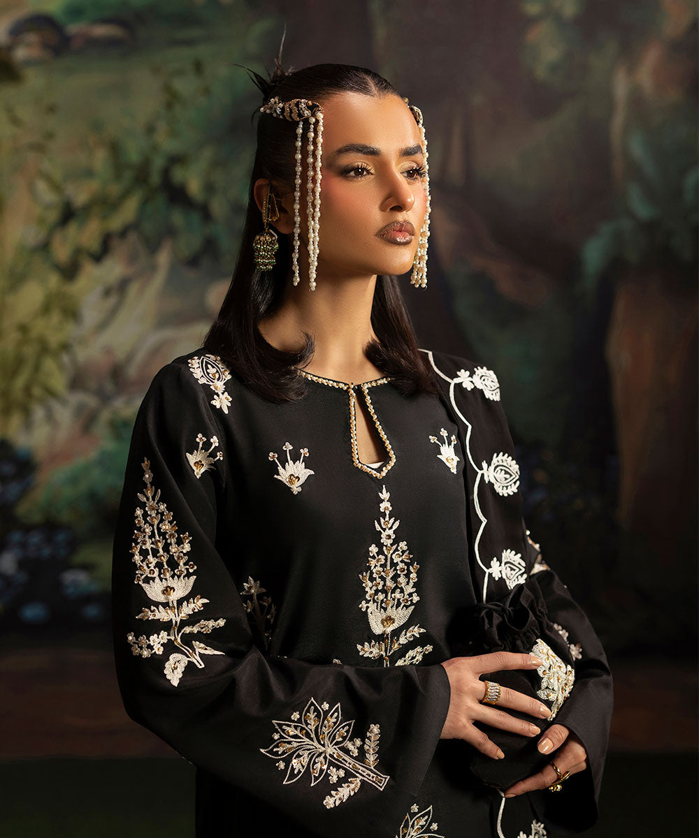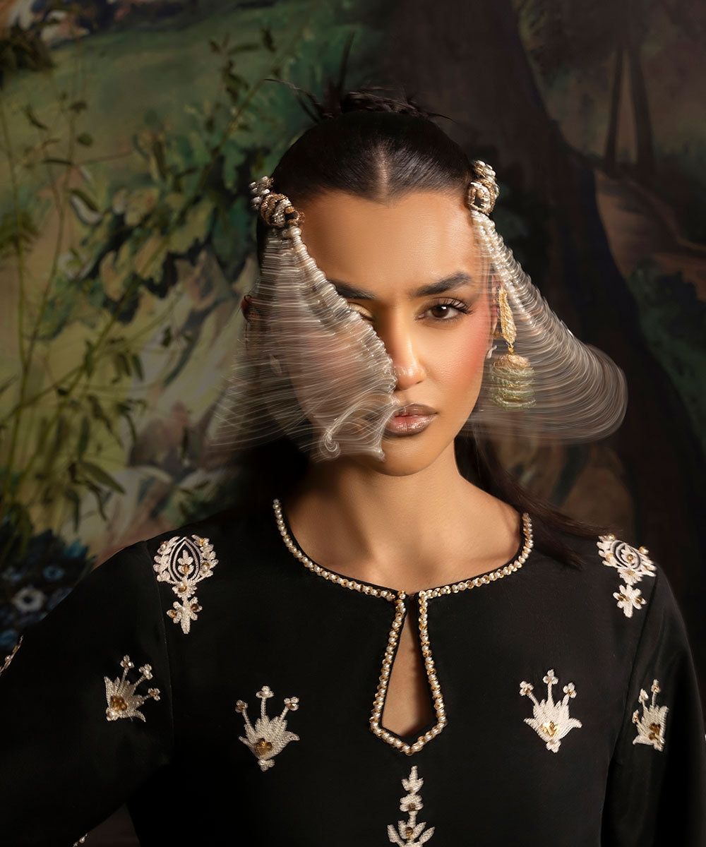 A luscious black silk canvas serves as a base for meticulously designed aari embroidered motifs in ivory shade. The intricately hand-embellished shirt is adorned with pearls and gold sequins. It is paired with black flared trousers.