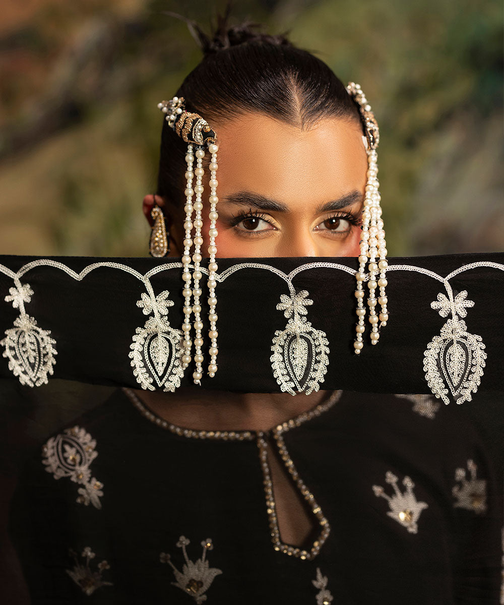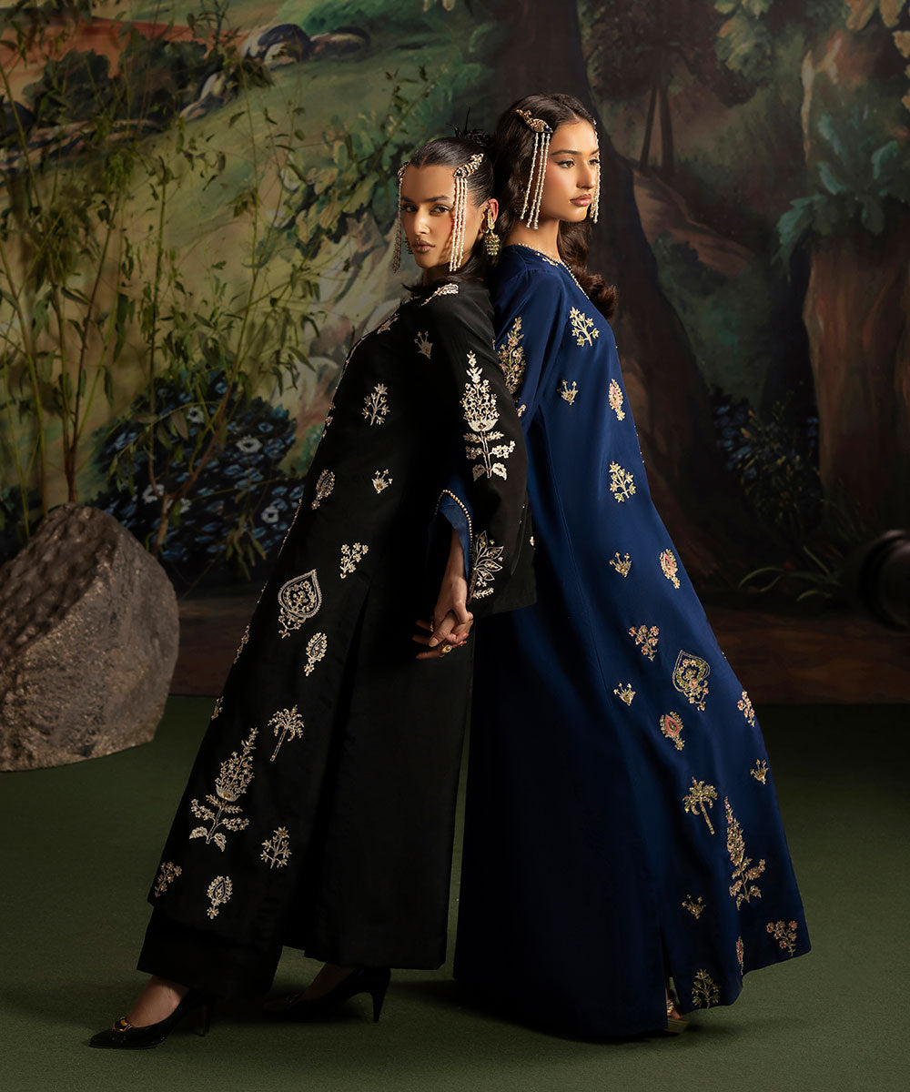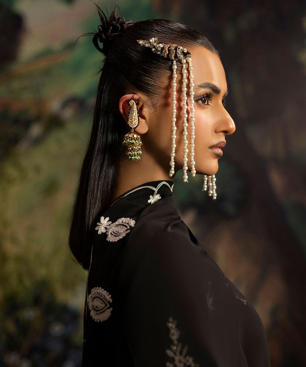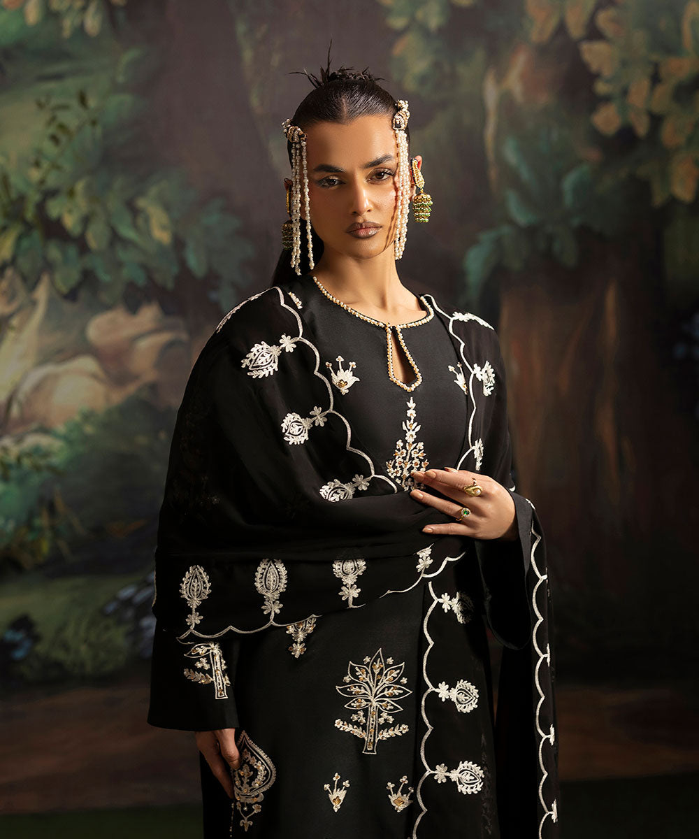 A luscious black silk canvas serves as a base for meticulously designed aari embroidered motifs in ivory shade. The intricately hand-embellished shirt is adorned with pearls and gold sequins. It is paired with black flared trousers.