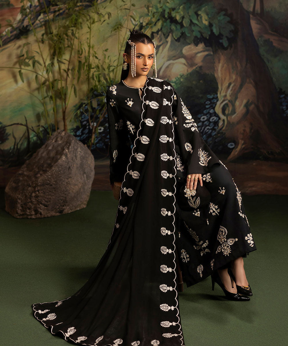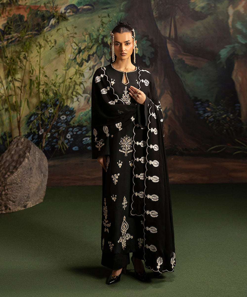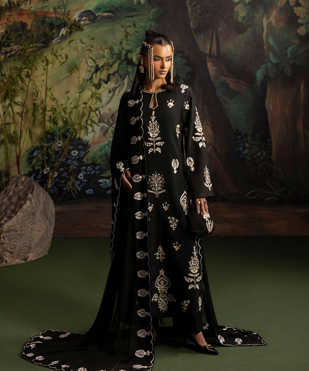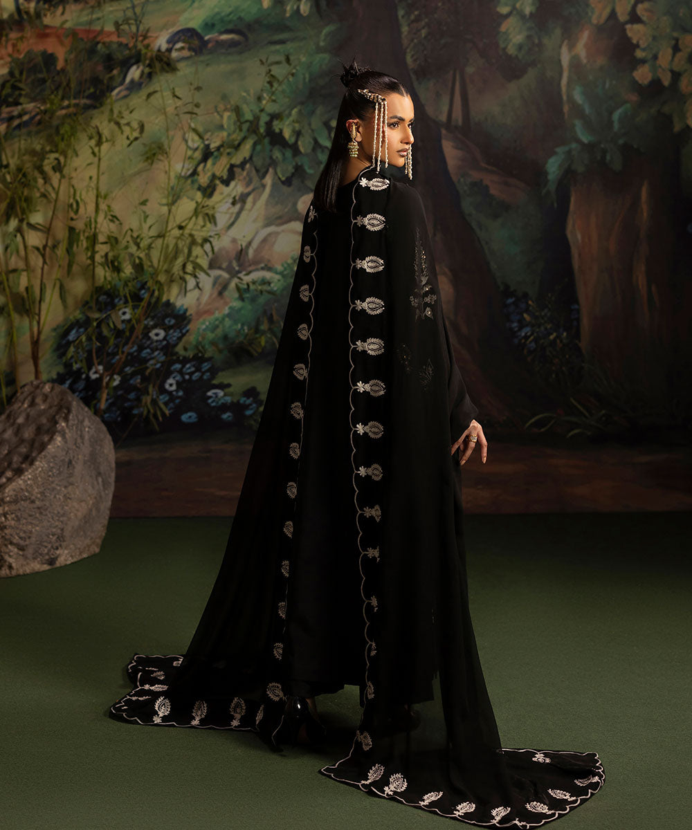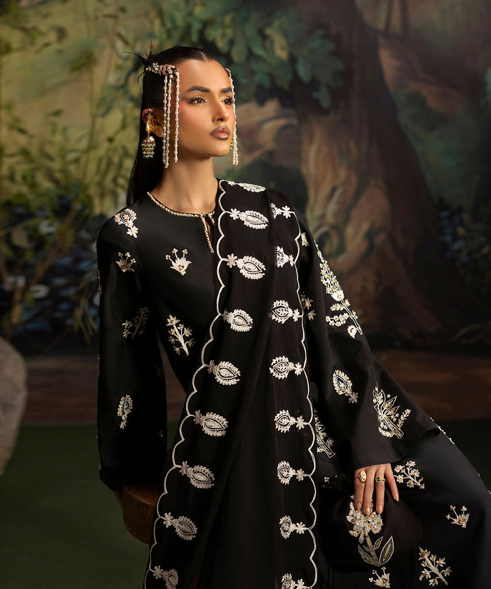 A luscious black silk canvas serves as a base for meticulously designed aari embroidered motifs in ivory shade. The intricately hand-embellished shirt is adorned with pearls and gold sequins. It is paired with black flared trousers.