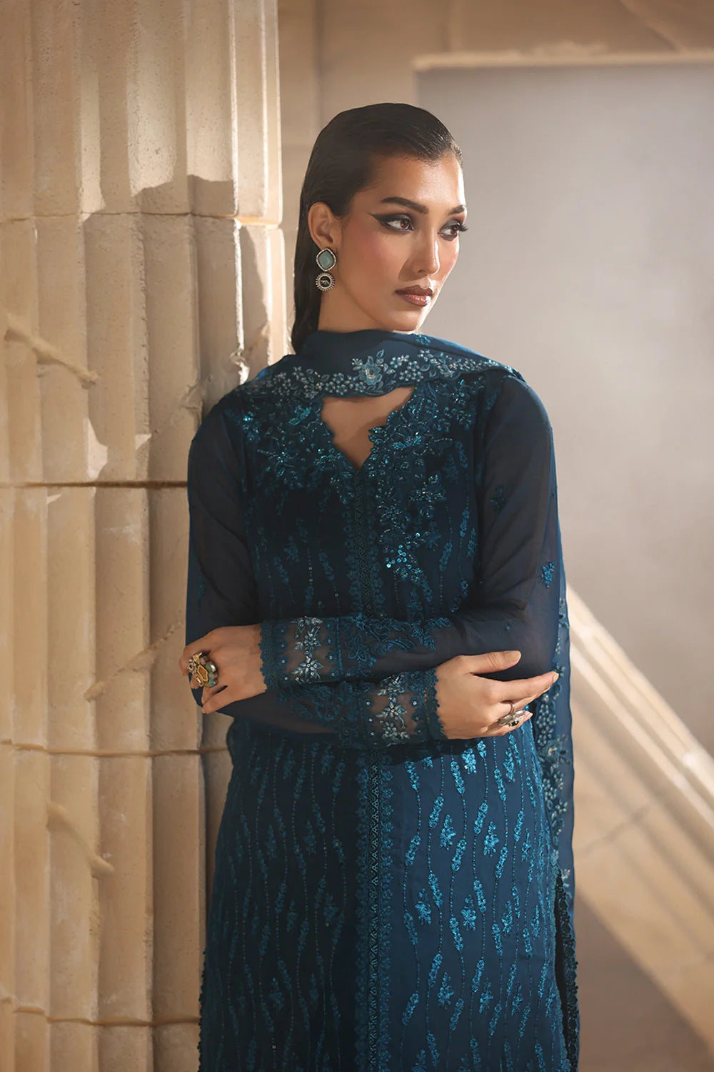 Softly enchanting and endlessly elegant, Celeste embodies refined sophistication in a serene tea blue hue. Crafted from luxurious chiffon, the ensemble features intricate hand embellishments on the neckline that add a touch of luminous charm. Paired with a sequin-embroidered chiffon dupatta and tailored culottes, Celeste captures the essence of effortless luxury — perfect for graceful festive moments.