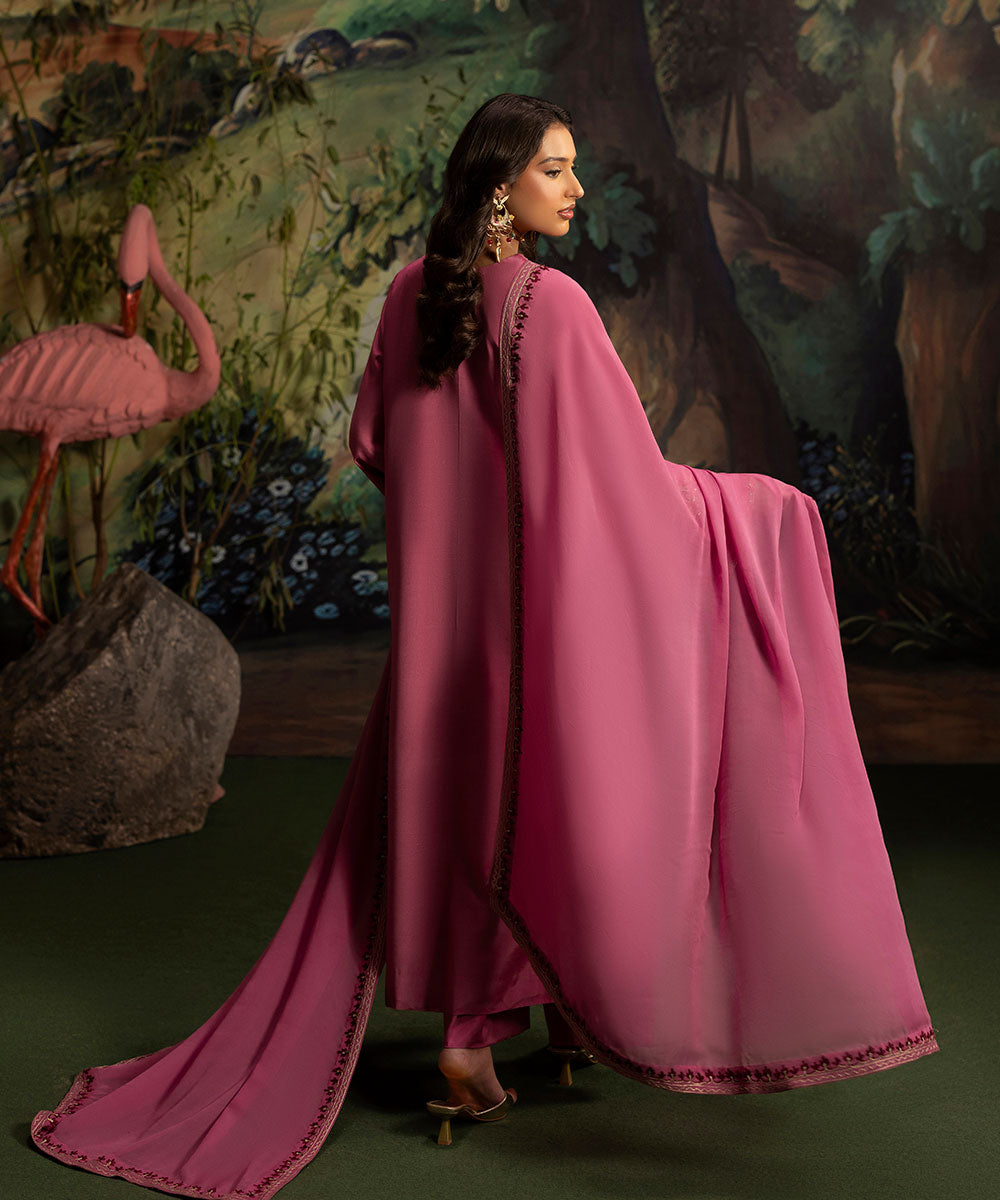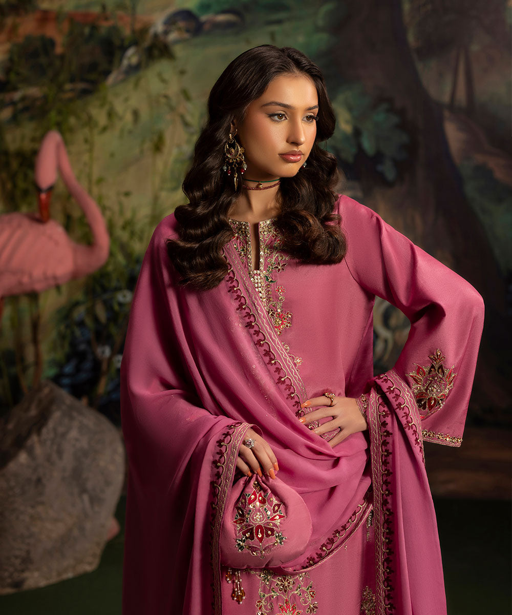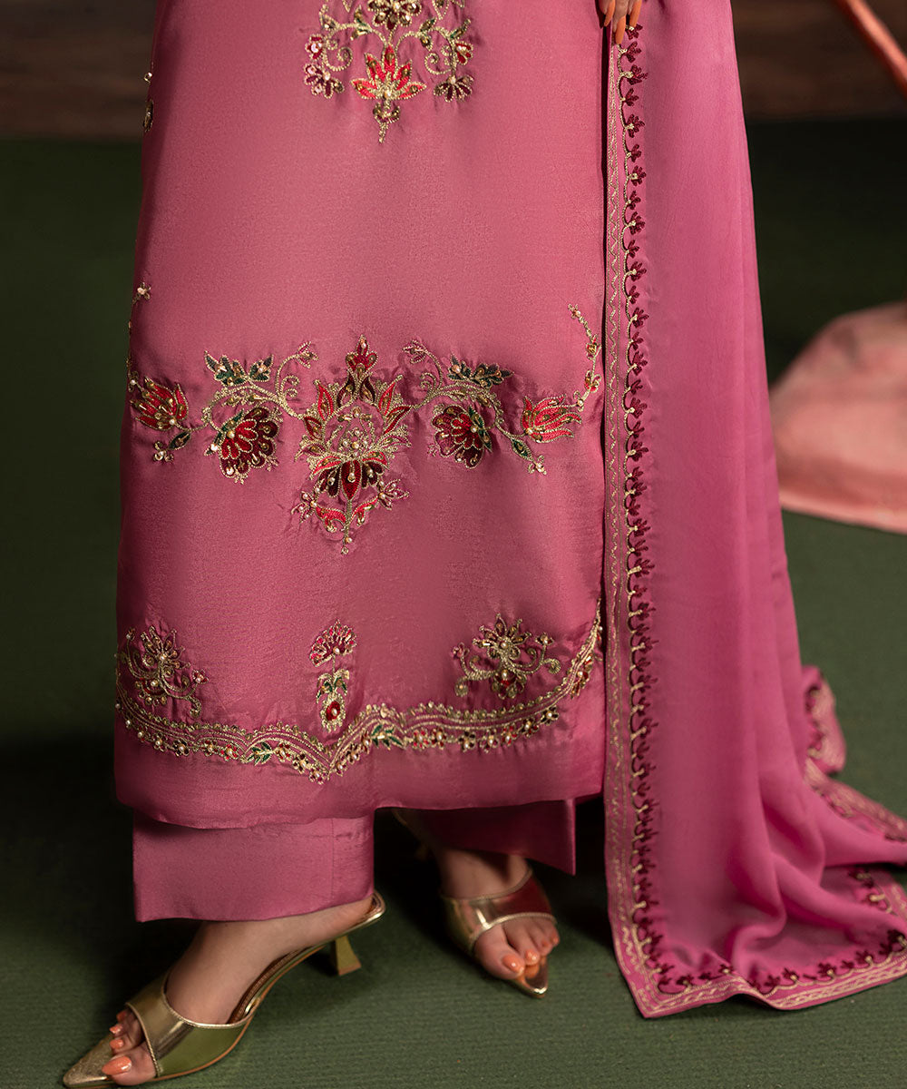 A tea pink silk canvas serves as a base for meticulously designed aari embroidery in pink, maroon and green. The intricately hand-embellished shirt is adorned with pearls and gold sequins. It is paired with flared trousers.