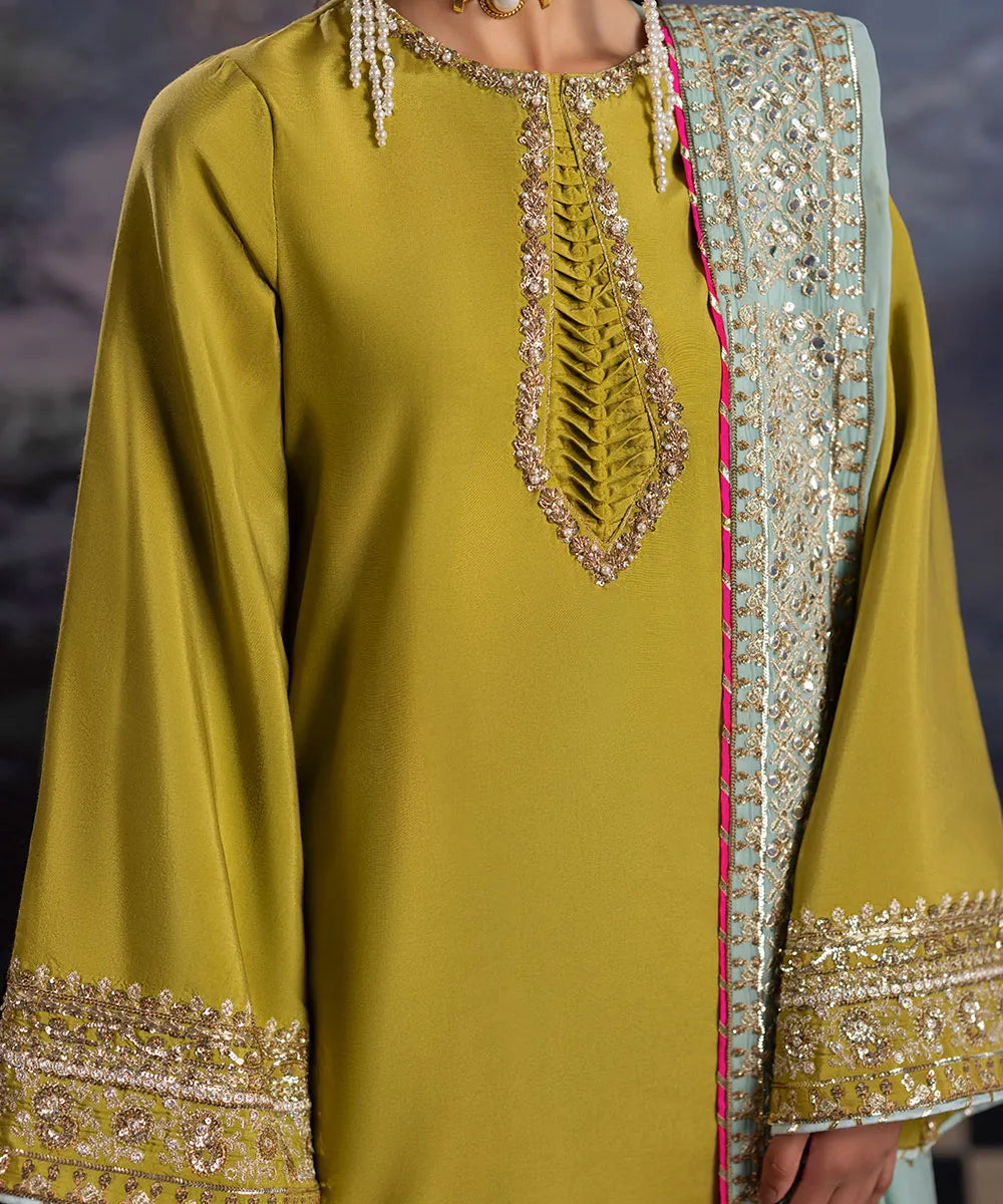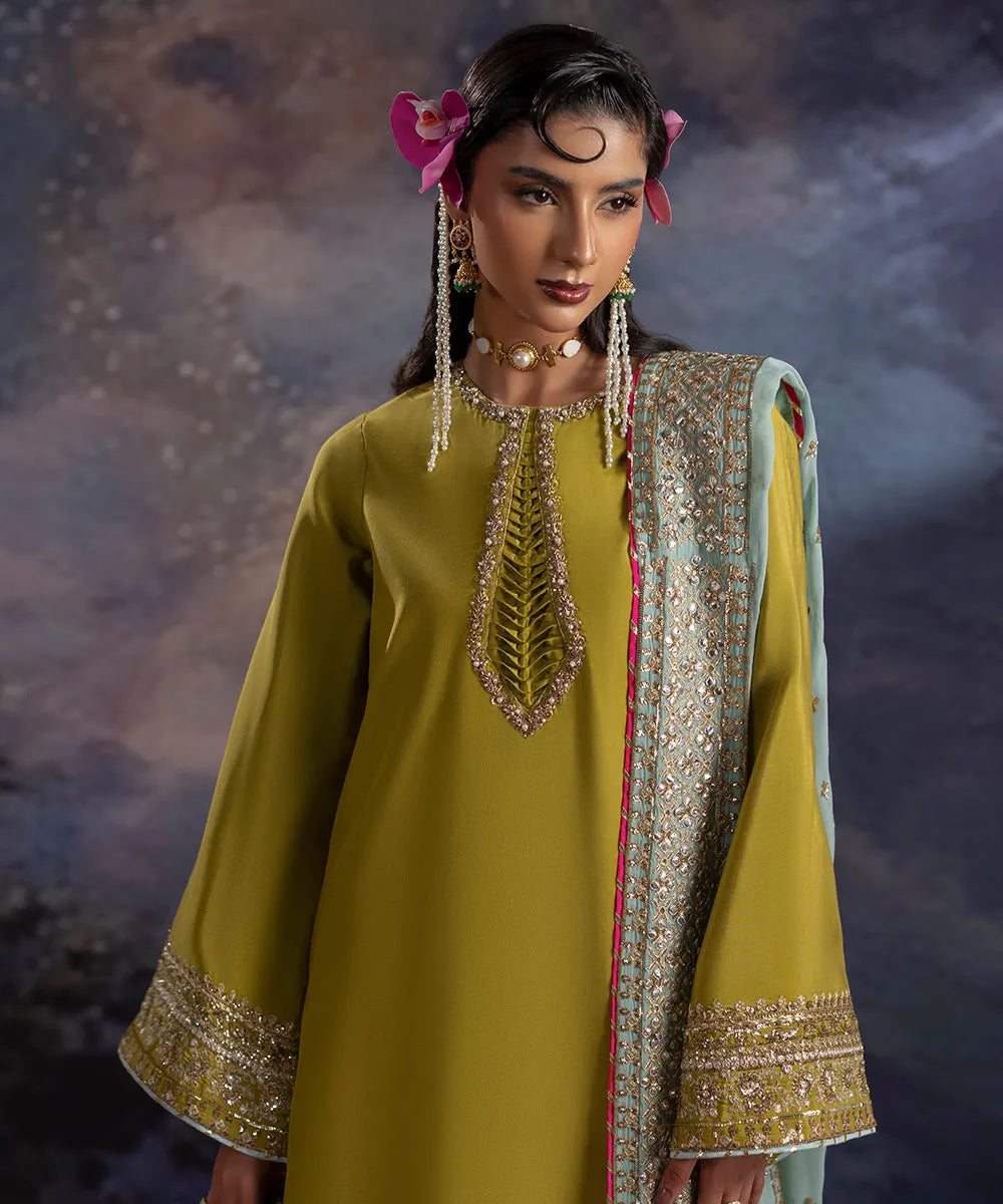 An olive green silk ensemble features a long shirt adorned with delicate golden sequin work, adding a subtle shimmer to the look. It is paired with hot pink flared trousers with an embroidered border along with a flowing chiffon dupatta with panni work and pink finishings.