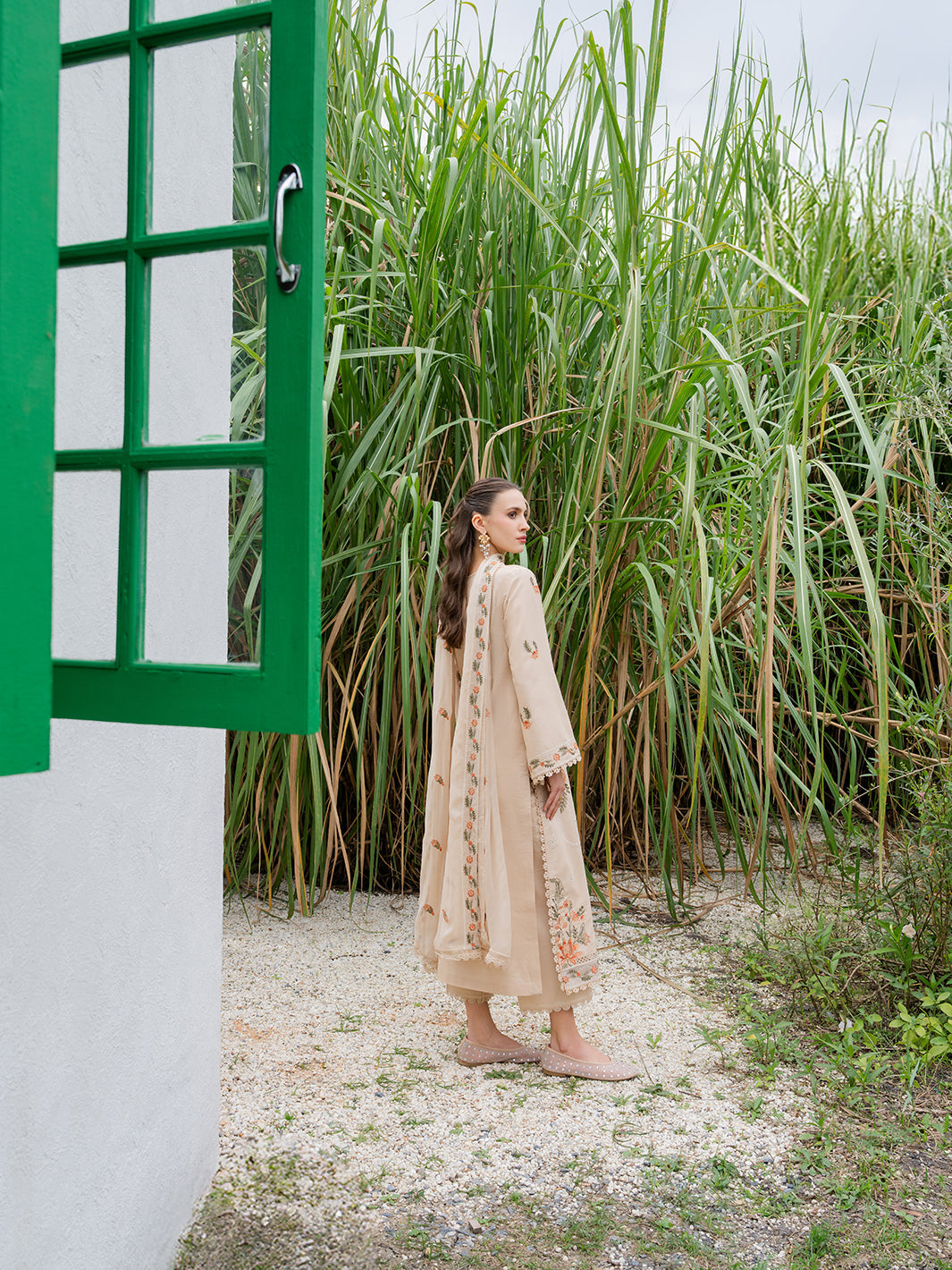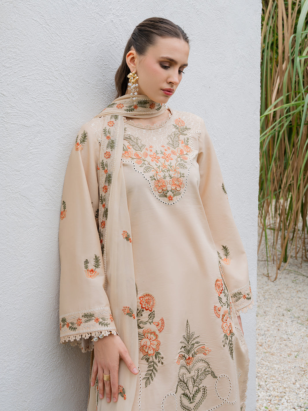Solara features refined embroidery that enhances its soft, earthy tone. The embroidered organza daman border adds definition, while the chiffon dupatta keeps the look light and breathable — ideal for sunlit celebrations and serene moments.