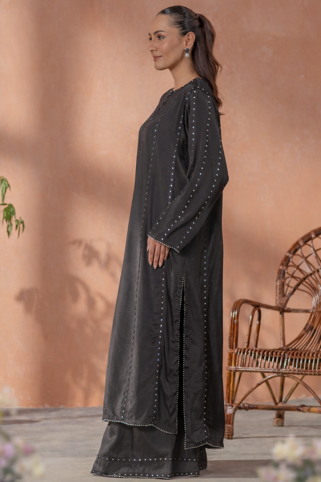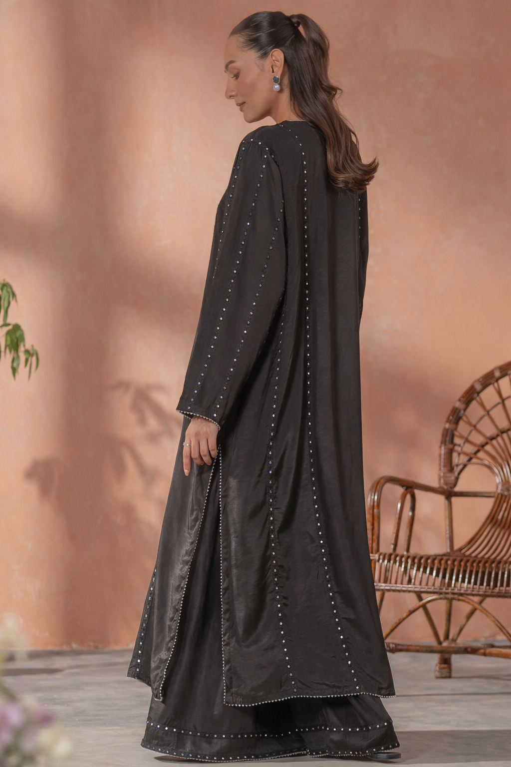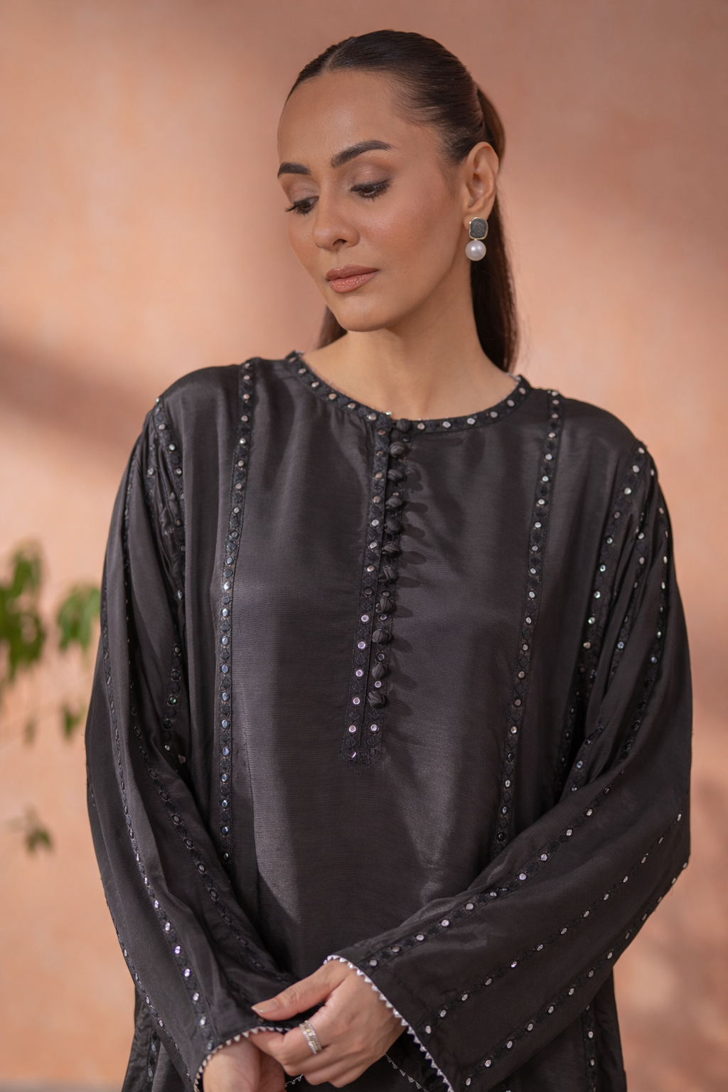Exuding understated grandeur, this rich black silhouette features intricate detailing and a regal fall for elevated evening elegance.