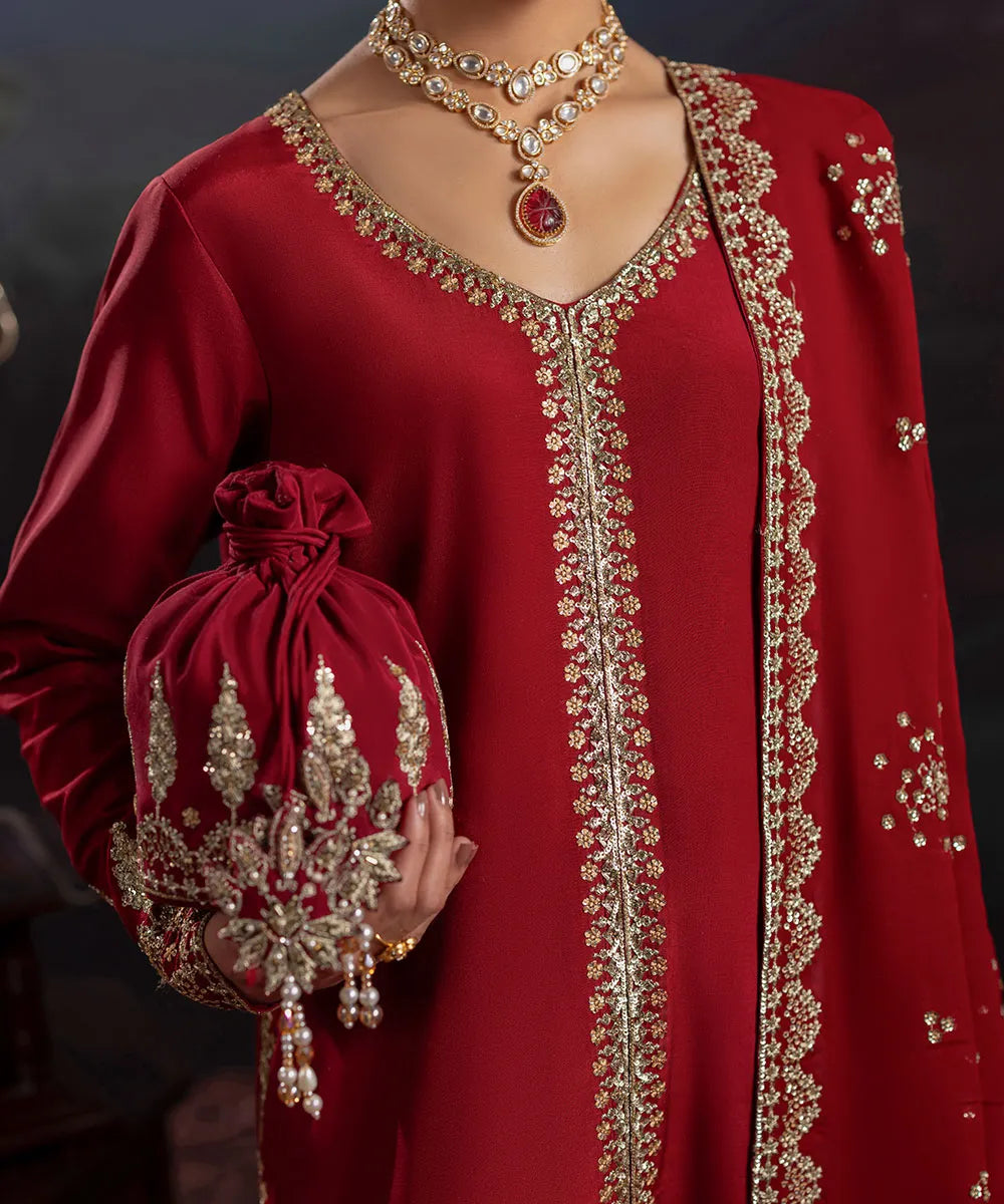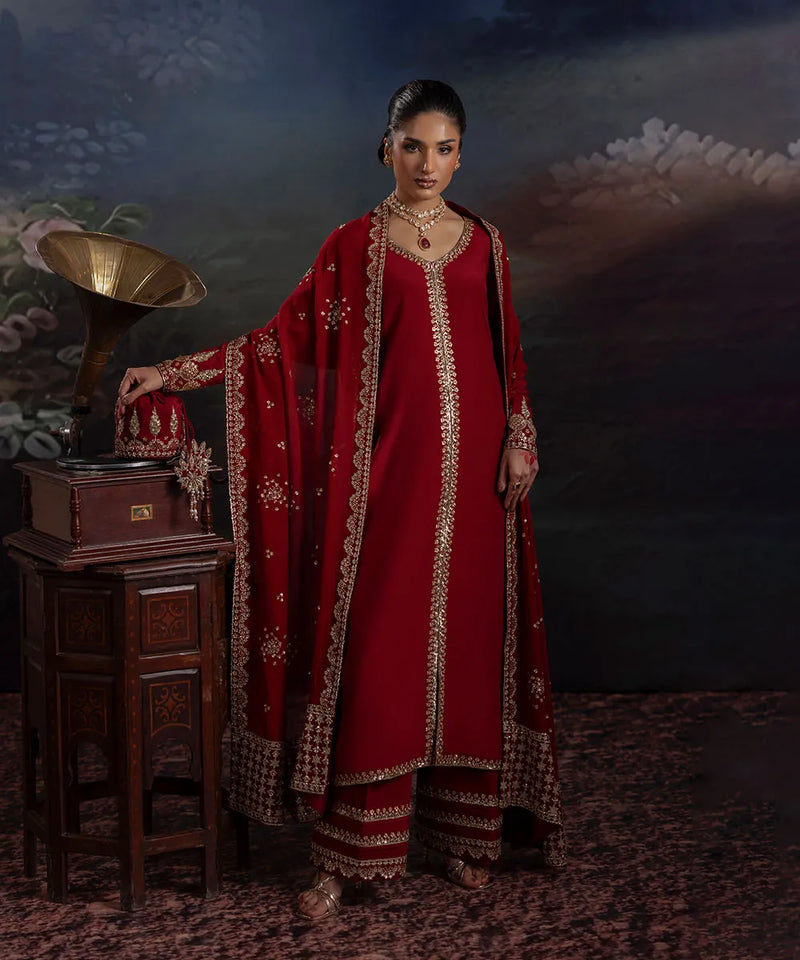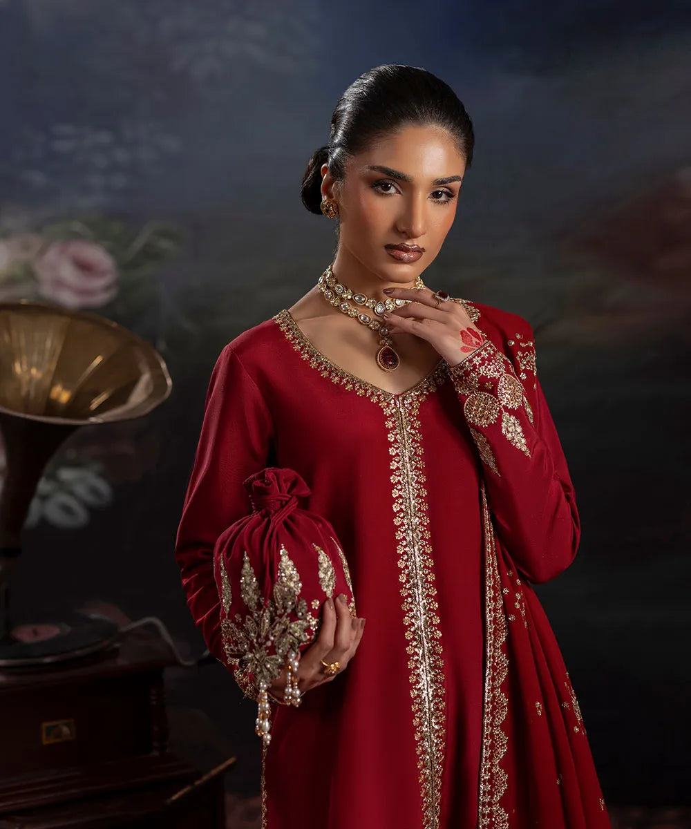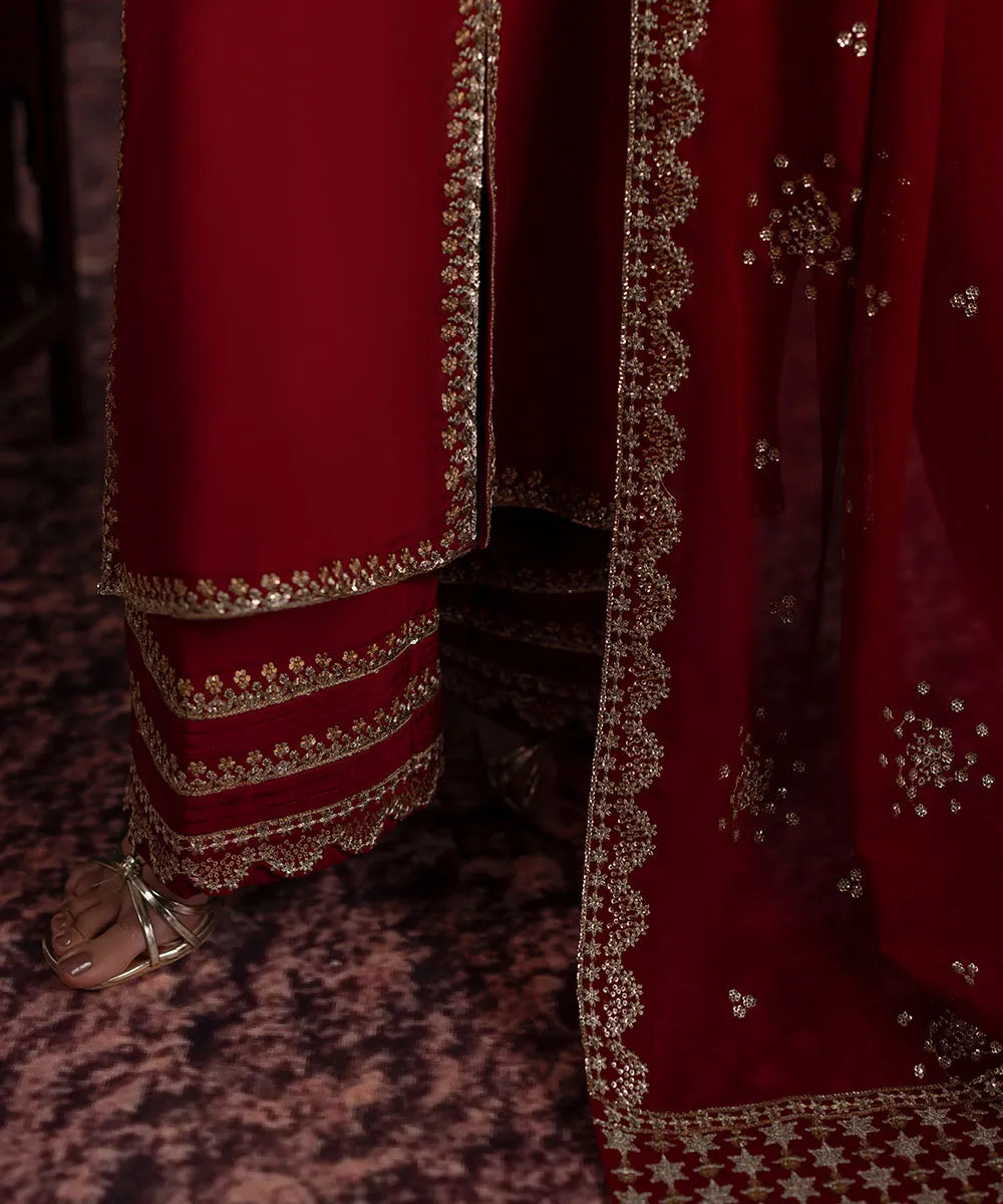 A maroon silk front-slit long shirt is adorned with delicate golden sequin work, adding a touch of sophistication. It is paired with maroon flared trousers featuring multiple borders and pleats. The chiffon dupatta boasts a lovely scalloped border on two sides and a heavier pallu with a sequin spray in the middle.