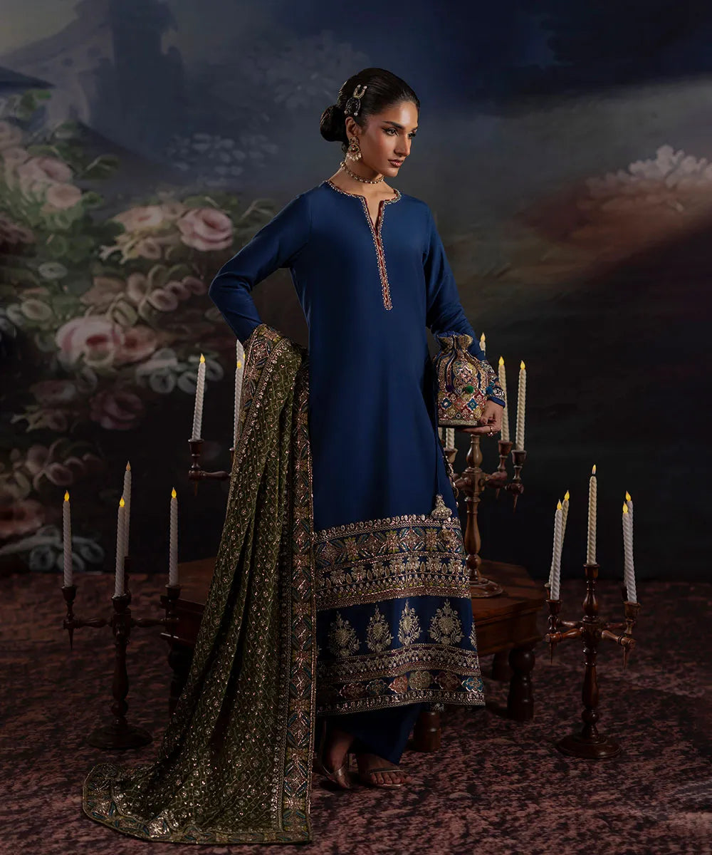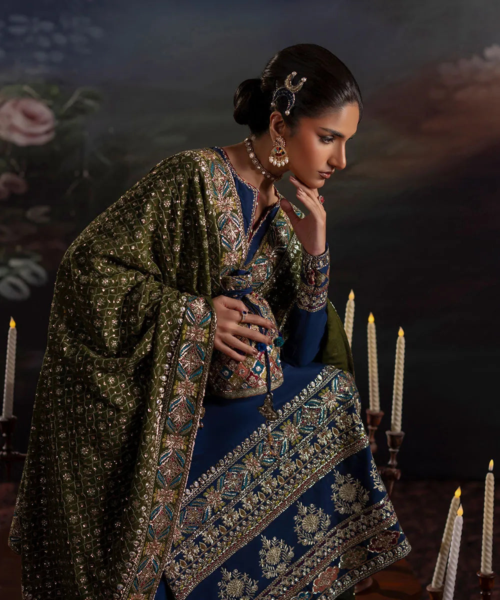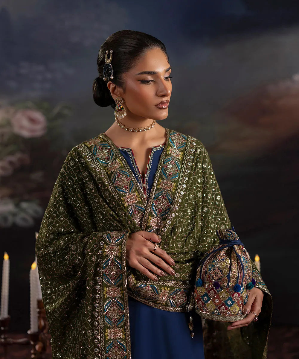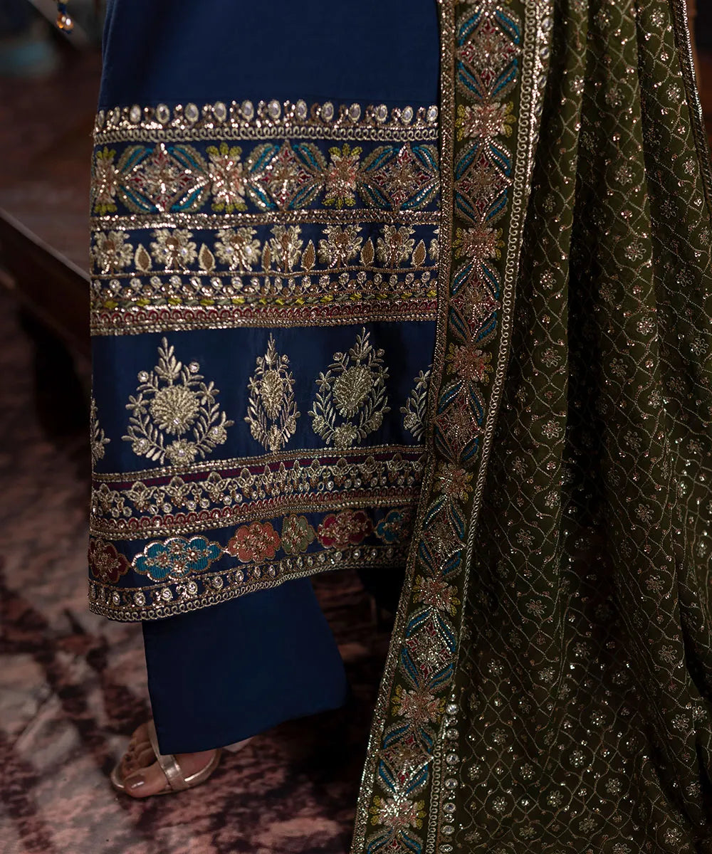 Navy blue silk shirt with golden sequin neckline and maroon chatta patti. Features multiple embroidered borders with multi-colored geometric and floral motifs. Paired with flared trousers and an olive green chiffon dupatta with heavy embroidery.