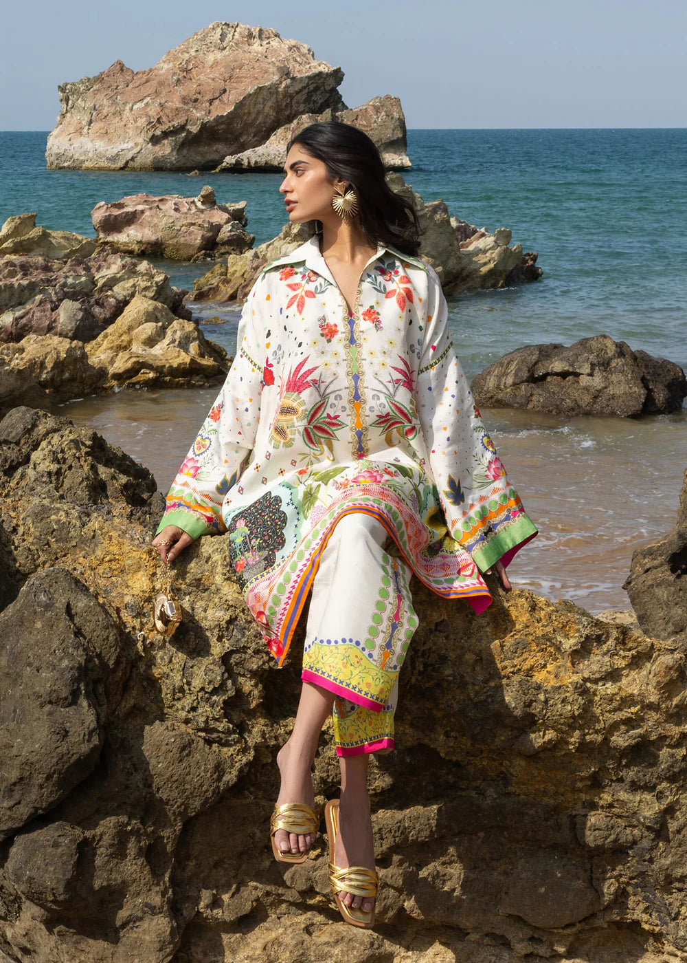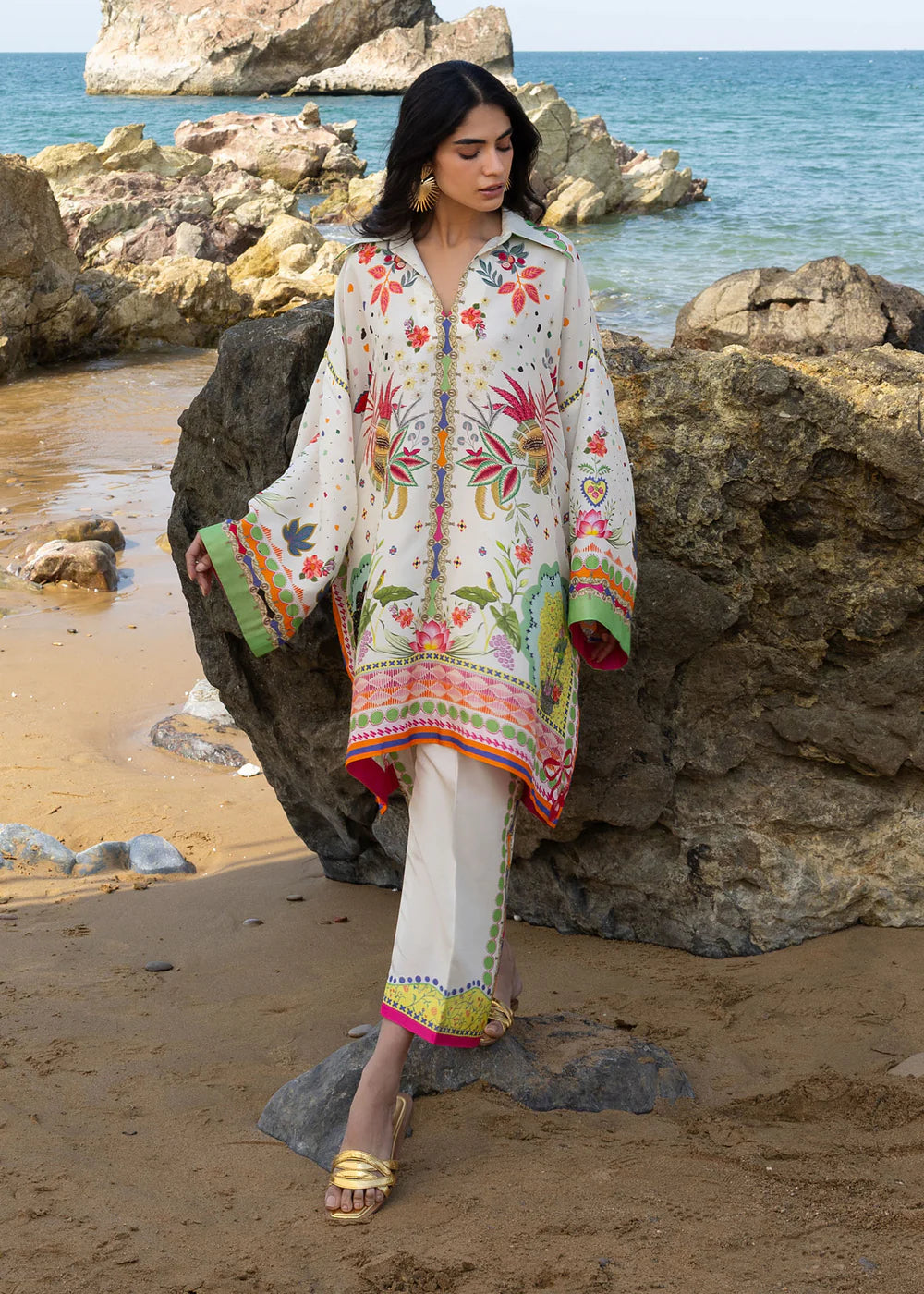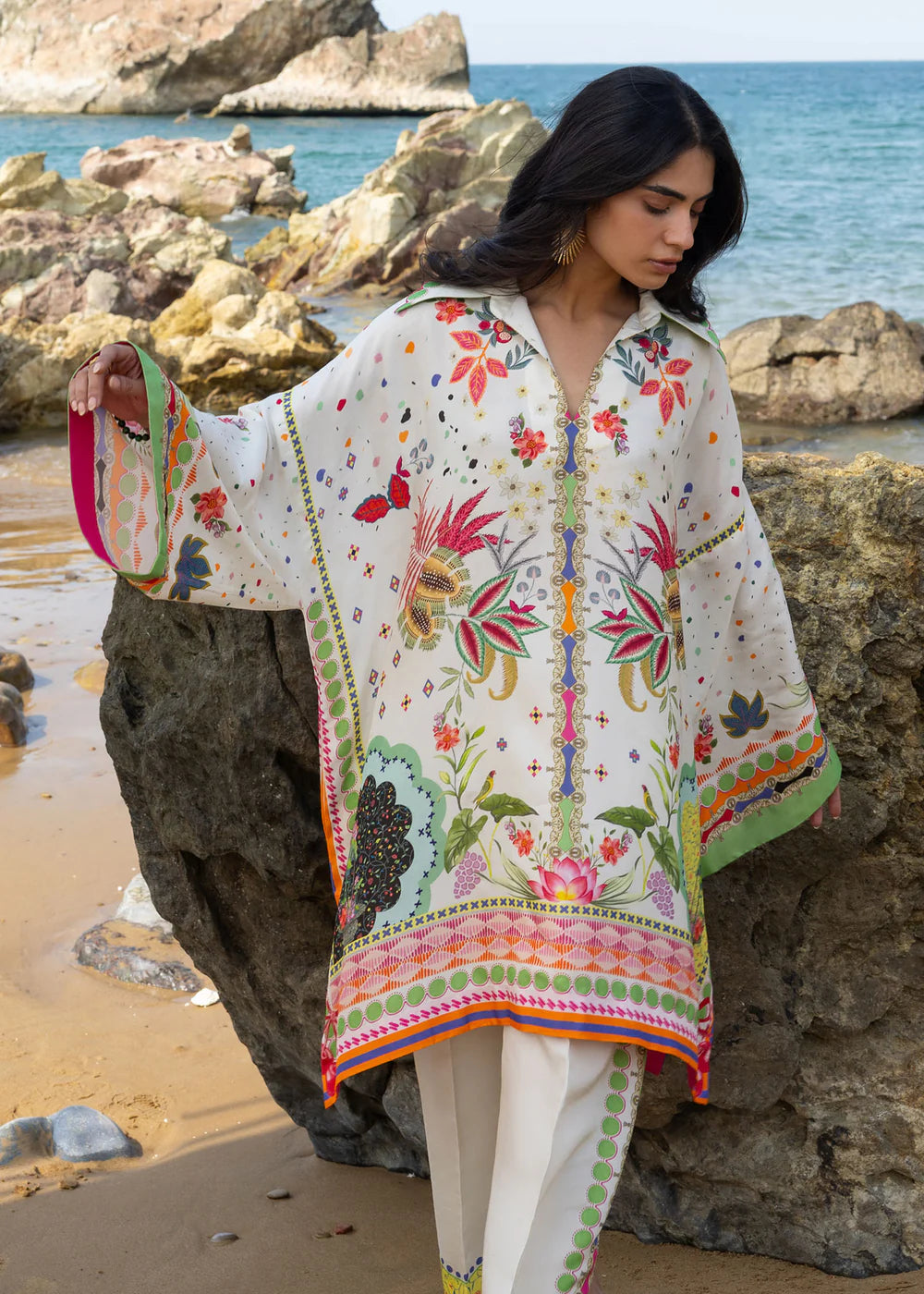 A breezy kaftan-inspired tunic falls just above the hips, paired with relaxed, wide-leg pants for ultimate comfort. Adorned with a vibrant botanical print of exotic florals and delicate foliage, the ensemble brings a touch of nature’s beauty to effortless everyday wear.
