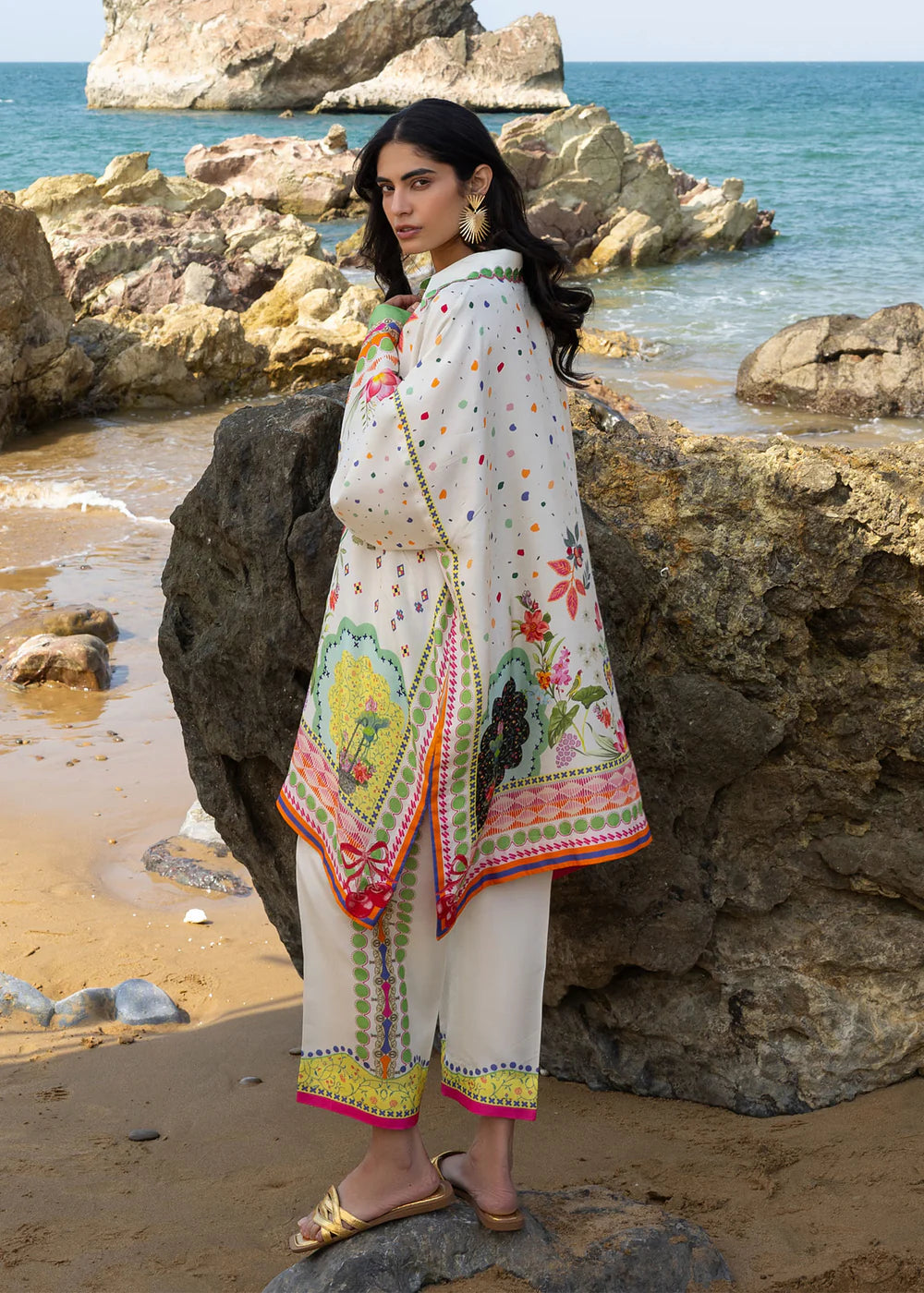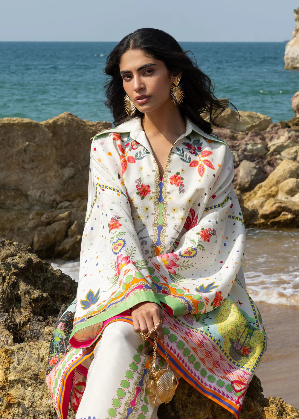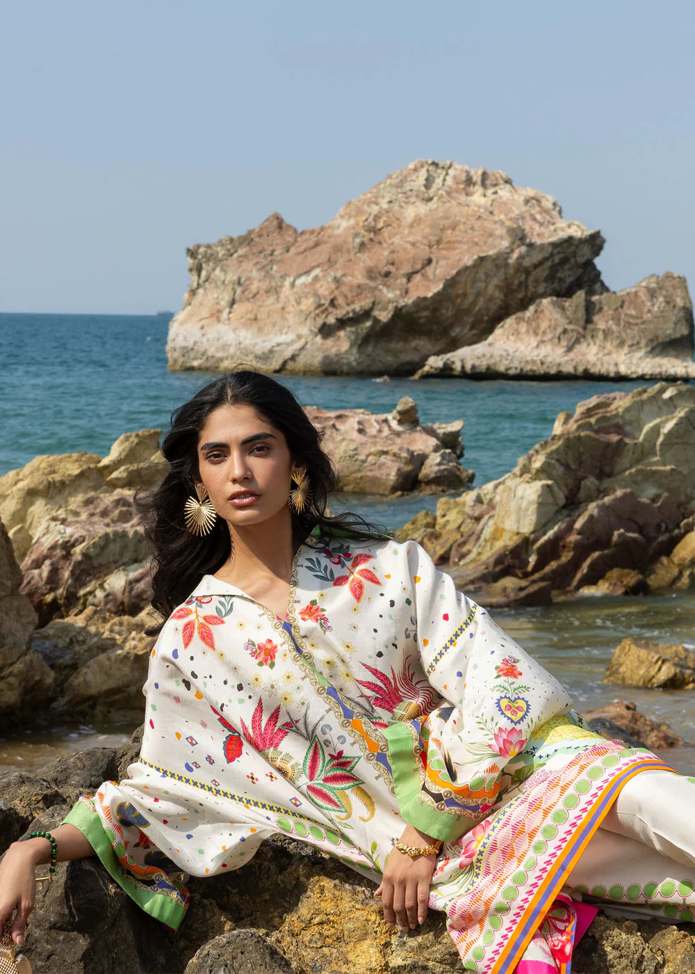 A breezy kaftan-inspired tunic falls just above the hips, paired with relaxed, wide-leg pants for ultimate comfort. Adorned with a vibrant botanical print of exotic florals and delicate foliage, the ensemble brings a touch of nature’s beauty to effortless everyday wear.