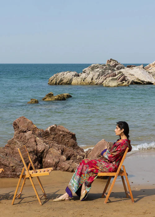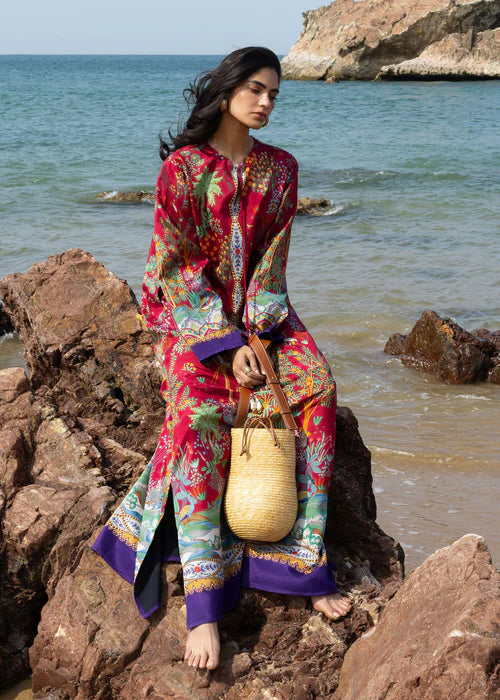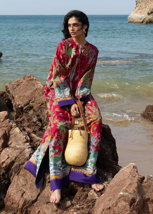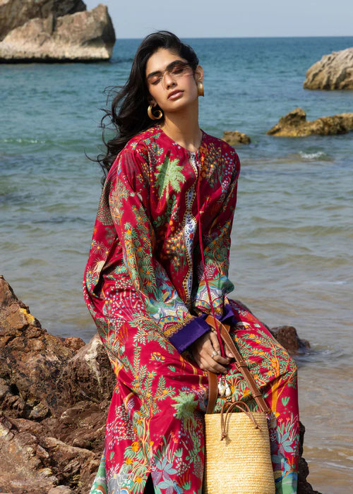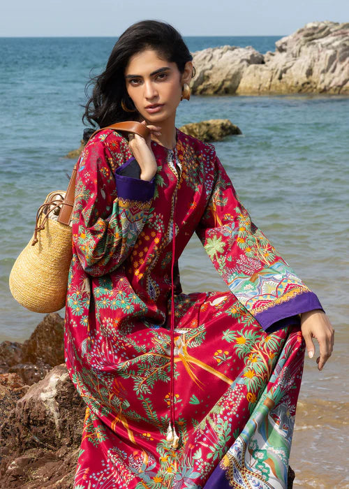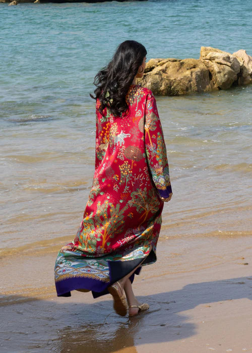 A fluid crimson red kaftan on heavy Russian grip blooms with vivid tapestry of mughal inspired botanicals. A celebration of opulence and untamed beauty.