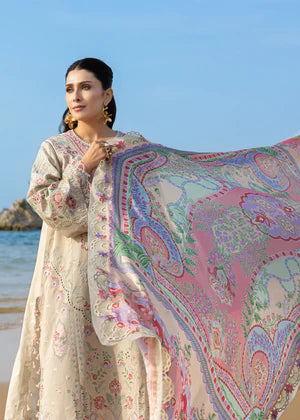 "Flamingo pink vibrant lawn set comes with a heavily composed layout in accents of lavender and pink tones. Organza embroidered borders complete the framing of this design.