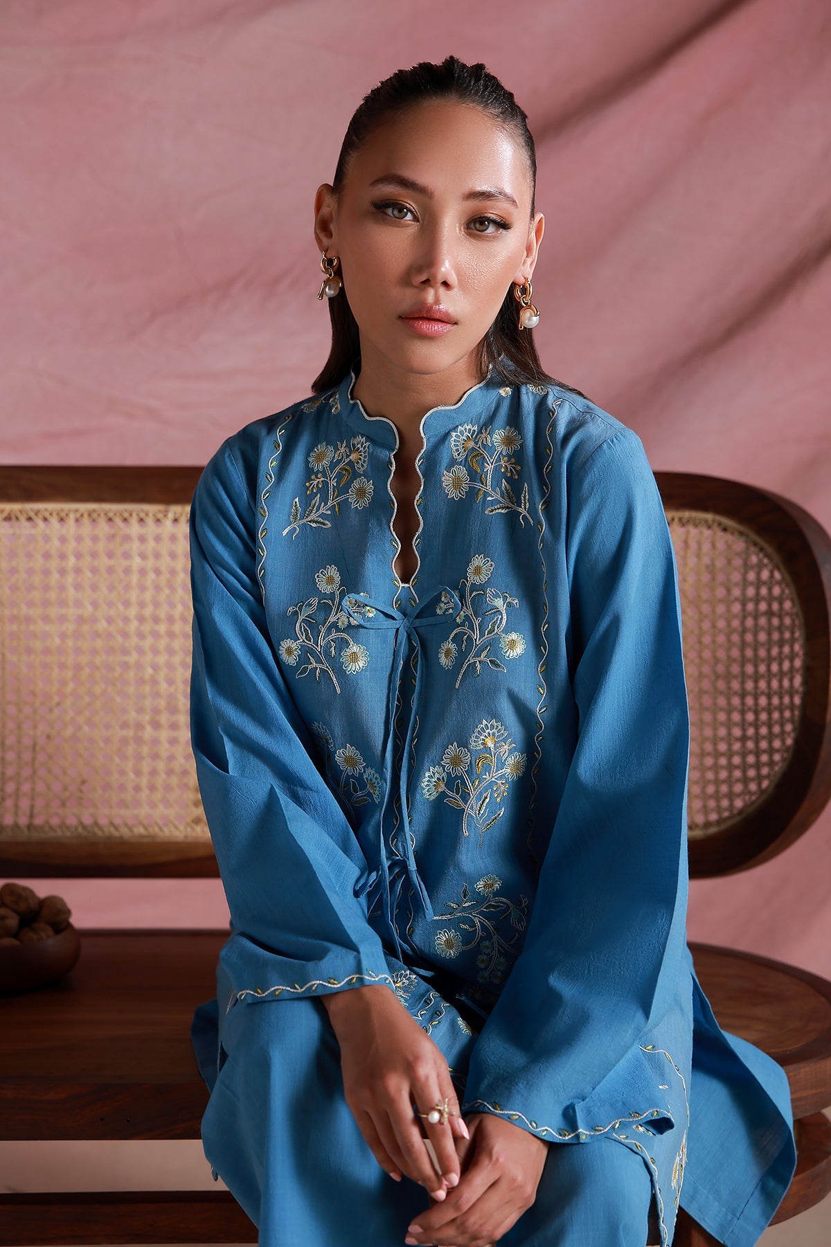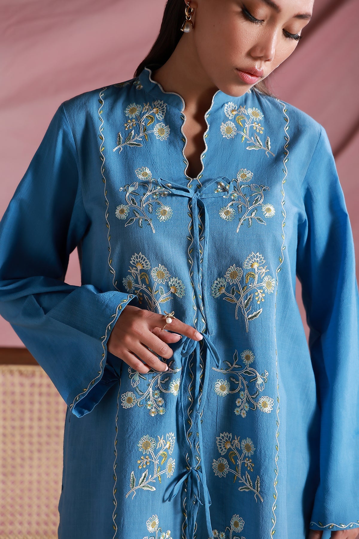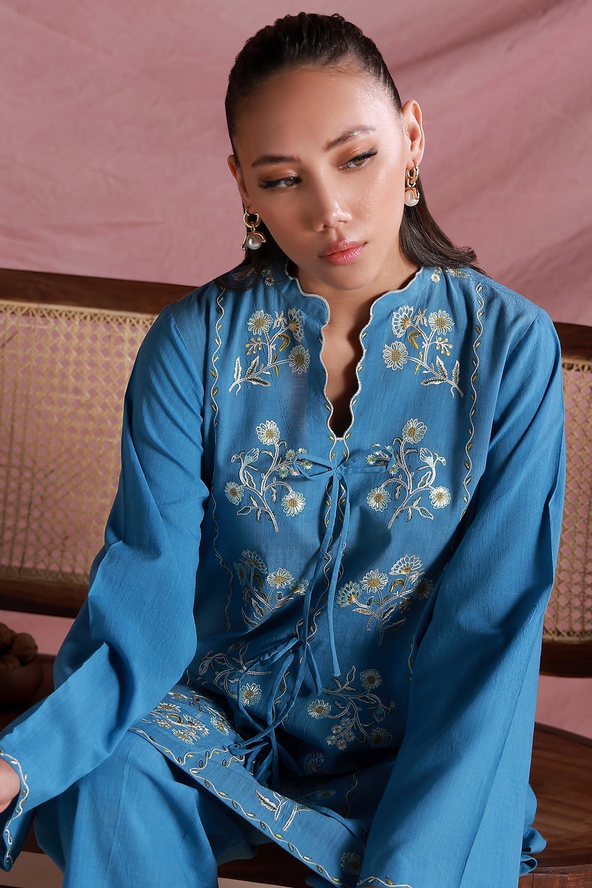 This ocean blue two-piece set features a straight-cut kurta with a scalloped band collar and subtle tie-up detail with bows. Delicate floral embroidery adorns the front and hem, framed with fine scalloped edging. Paired with matching wide-leg trousers