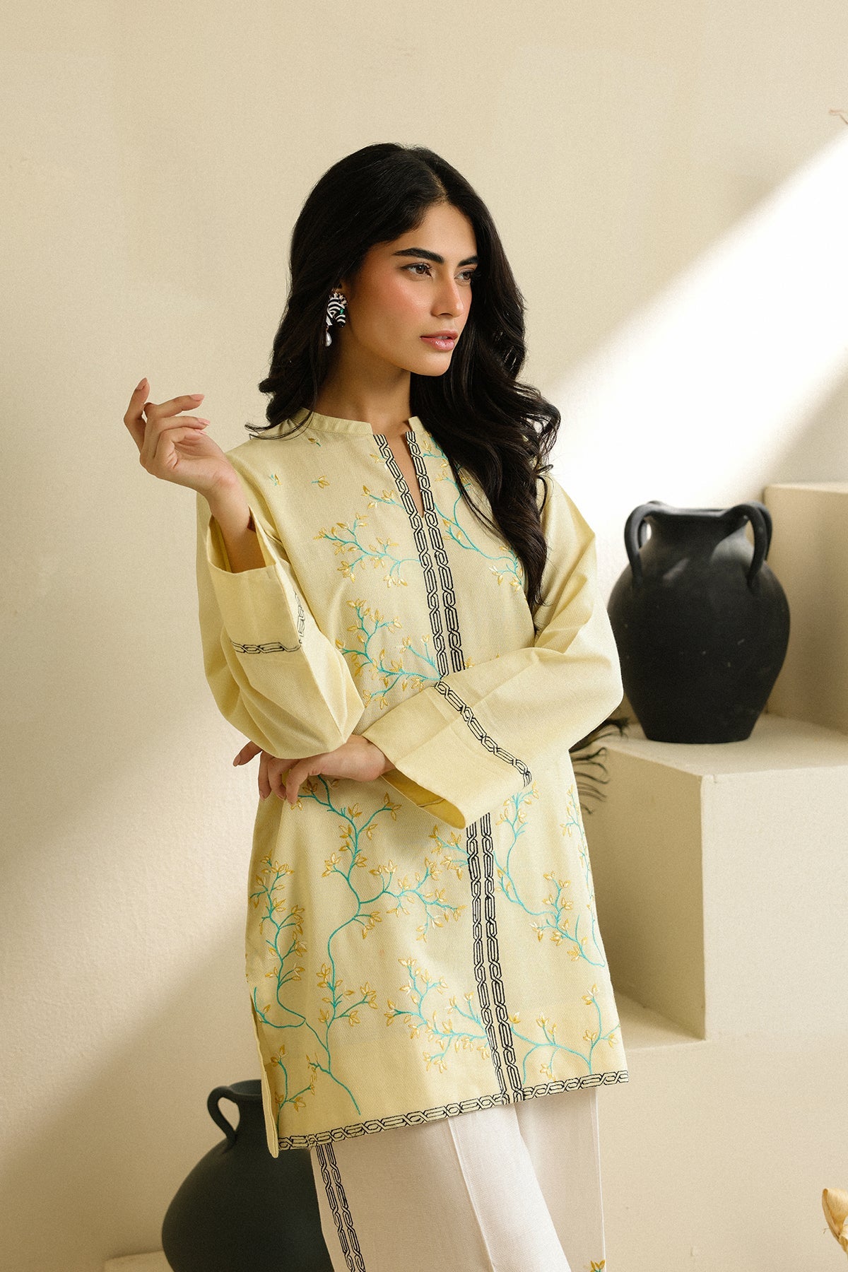 A serene blend of intricate embroidered leaves and quirky elements add a touch of artisanal charm to the ensemble. This butter yellow co-ord features a straight-cut, mid-length shirt paired with embroidered classic white culottes.