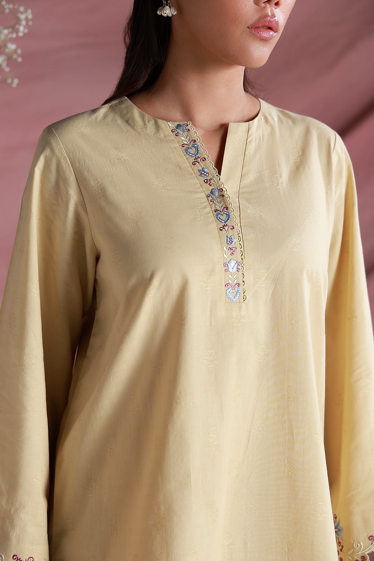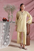 Butter yellow shirt featuring intricate embriodery detailing along the placket, with cutwork sleeves. Finished with subtle embriodery at the hem and a soft lace finish, paired with matching culottes for a graceful and timeless look.