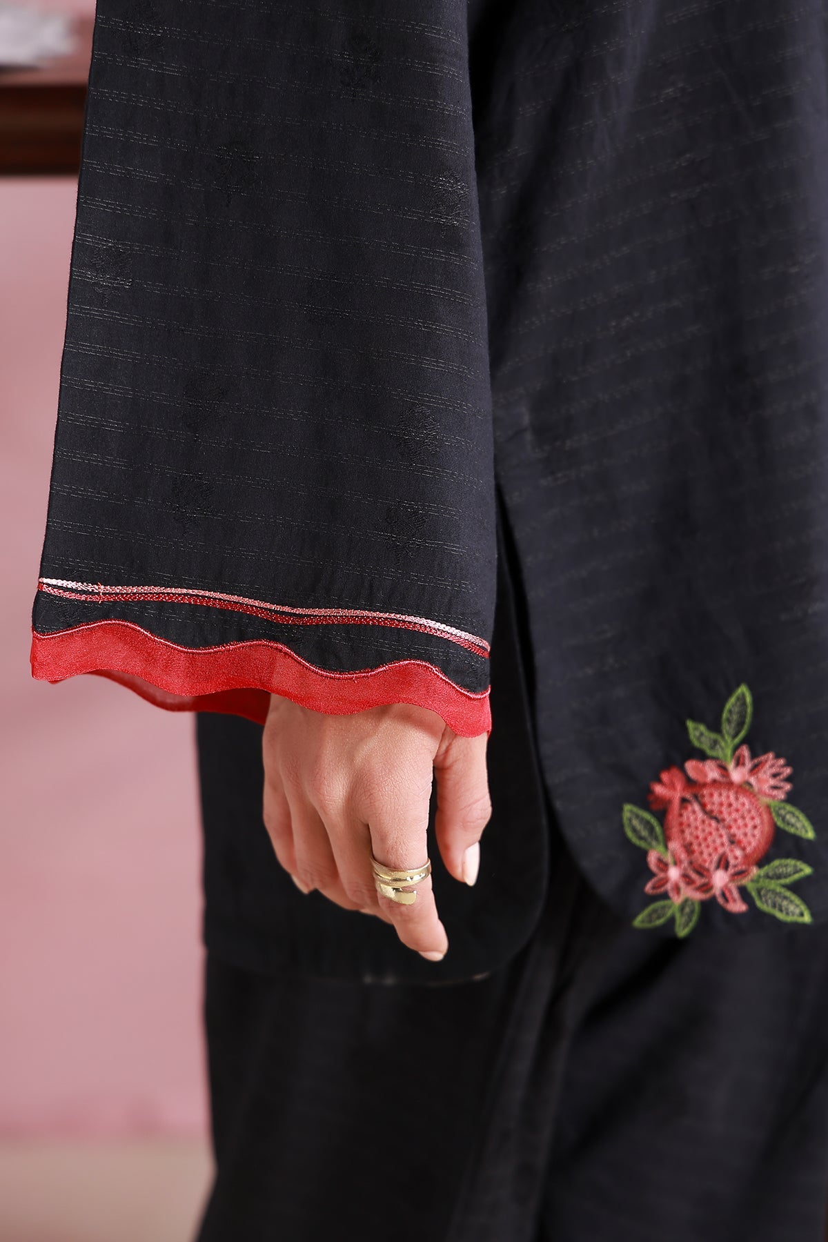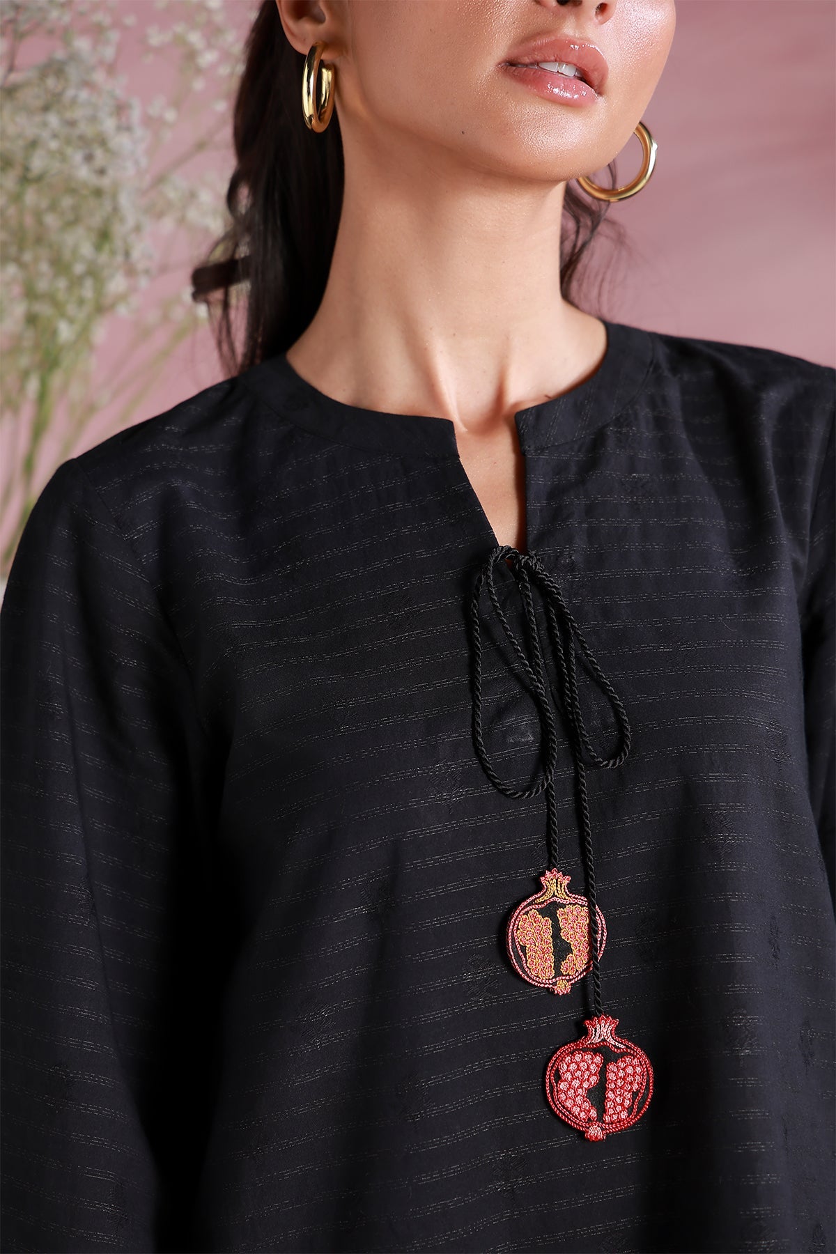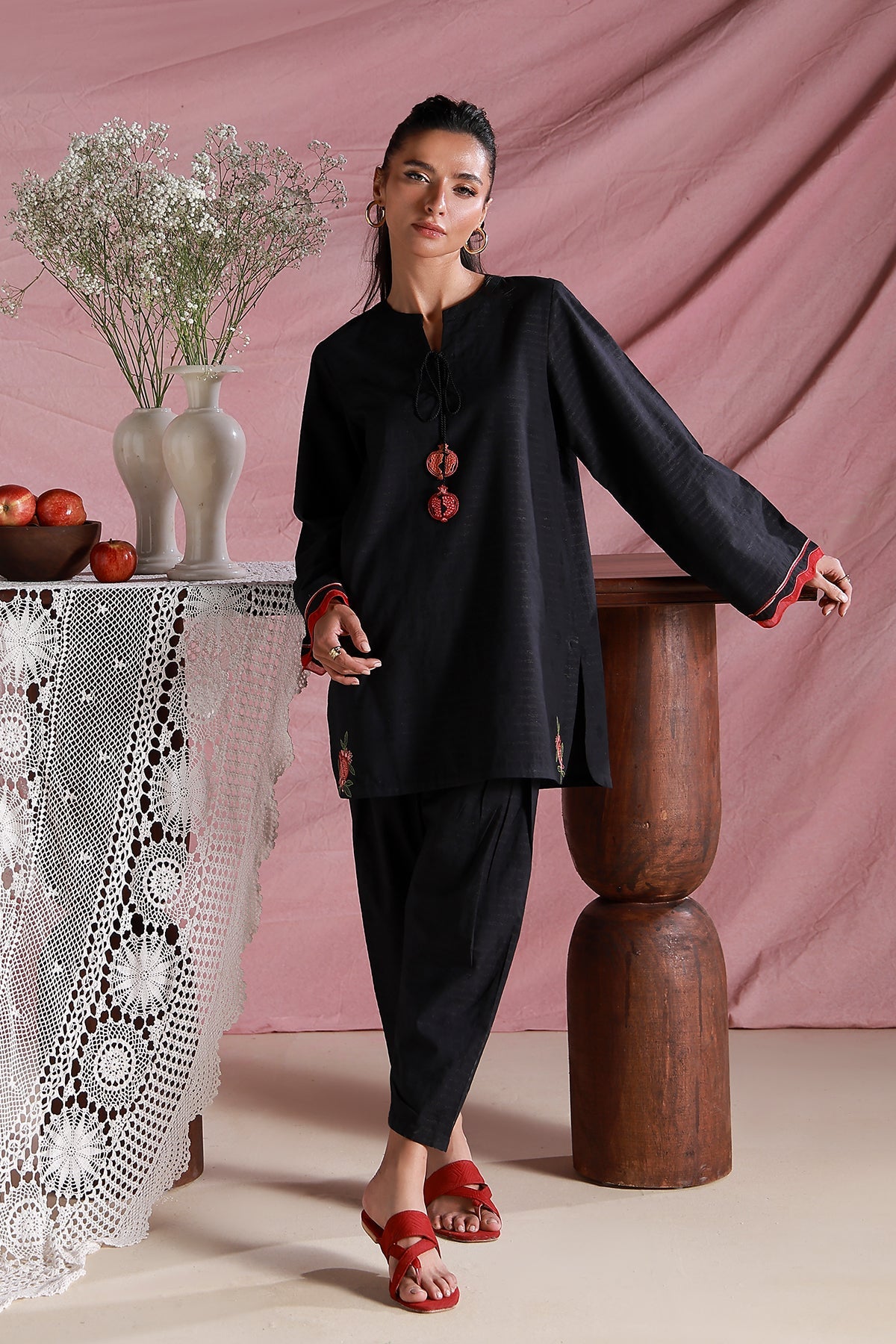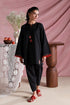 This elegant black ensemble features embroidered anaar tassels and motifs along the hem. The scalloped embroidery on the sleeves, paired with tapered pants, achieves a flawless balance of comfort and sophistication.