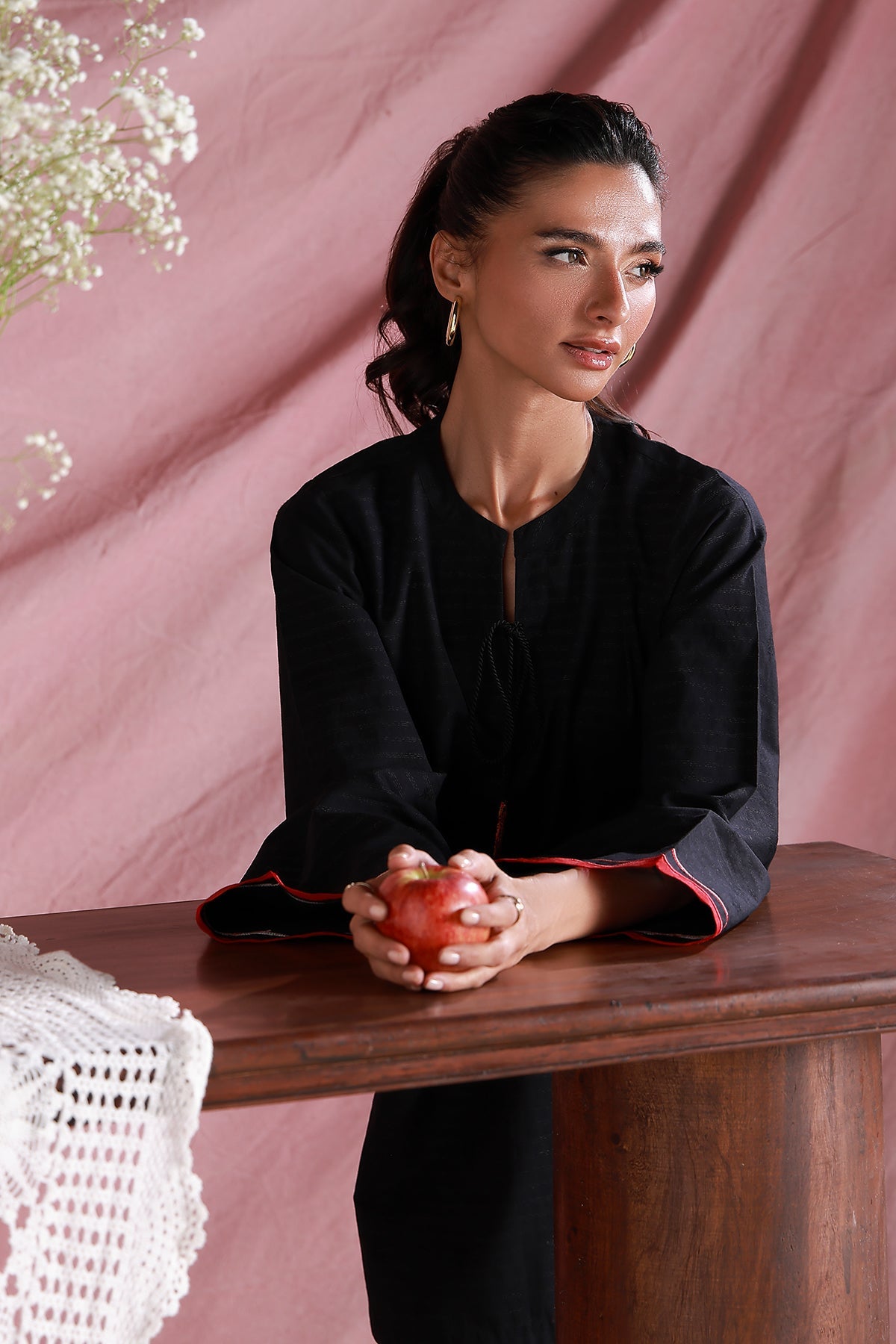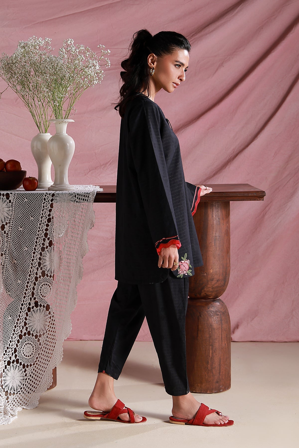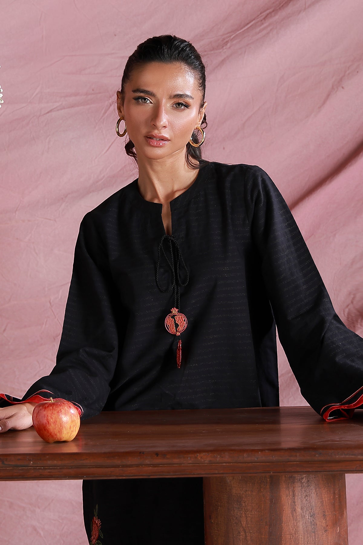 This elegant black ensemble features embroidered anaar tassels and motifs along the hem. The scalloped embroidery on the sleeves, paired with tapered pants, achieves a flawless balance of comfort and sophistication.