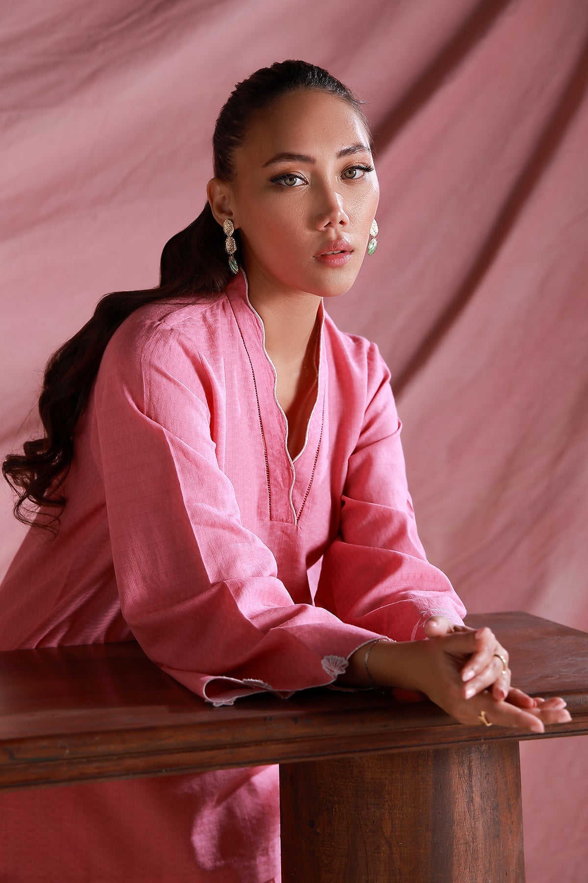 Featuring white marine inspired embroidery across the neckline, sleeves, and hem, complemented By 3D shell embellishment details on the sleeves. Paired with big shalwar for an effortless look.