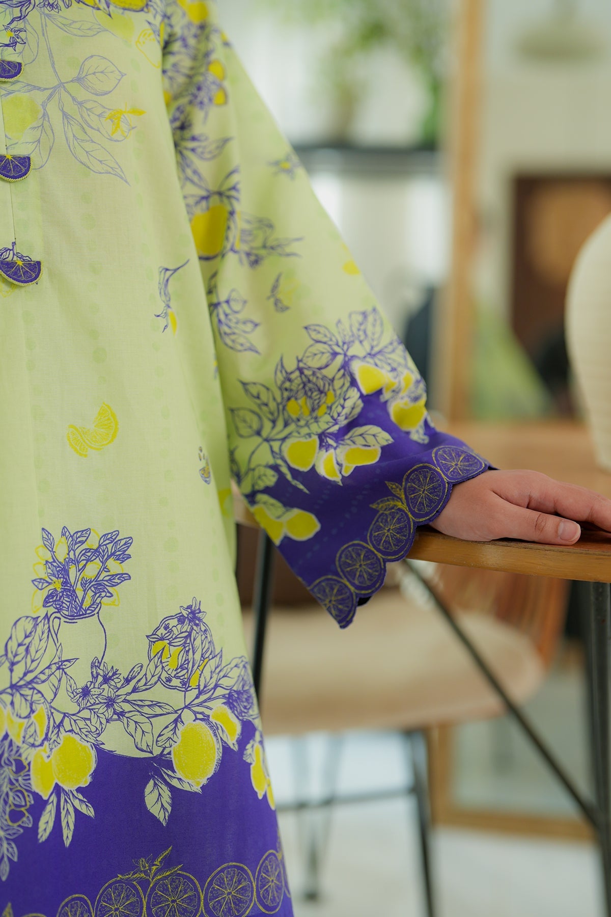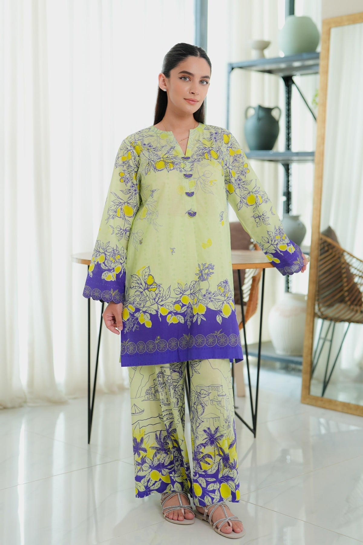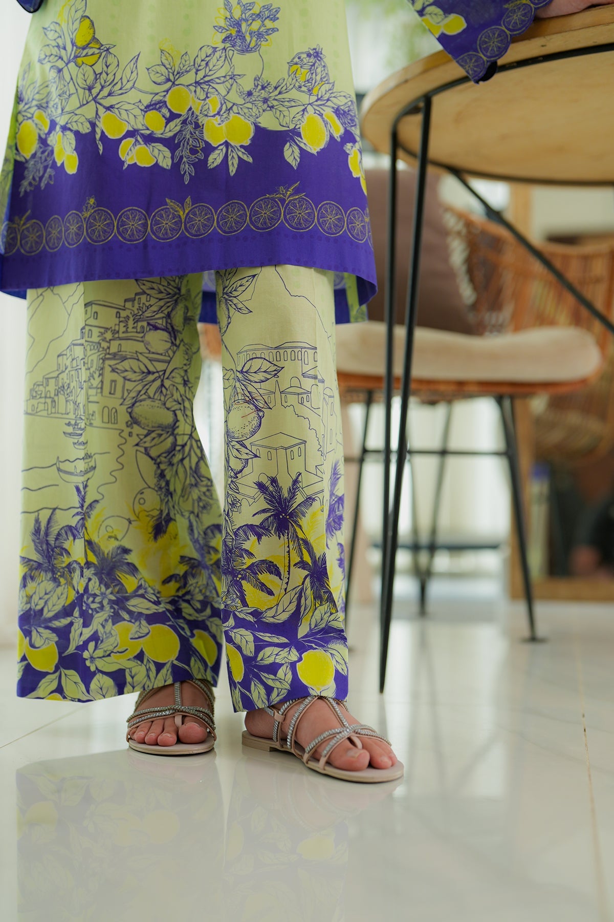 A refreshing two-piece on a lime-green base with bright yellow lemons, leafy branches, and cobalt-blue borders. The trousers feature scenic coastal art with palm trees, boats, and architecture, blended with lemon motifs. Styled as a straight-cut kurta with a V-slit neckline and wide-leg trousers for a breezy, elegant feel.