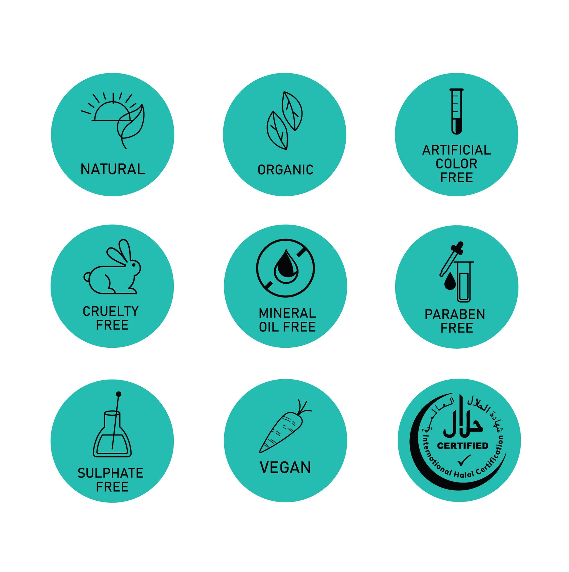 Natural, Organic, Artificial Color Free, Cruelty Free, Mineral Oil Free, Paraben Free, Sulphate Free, Vegan, Halal